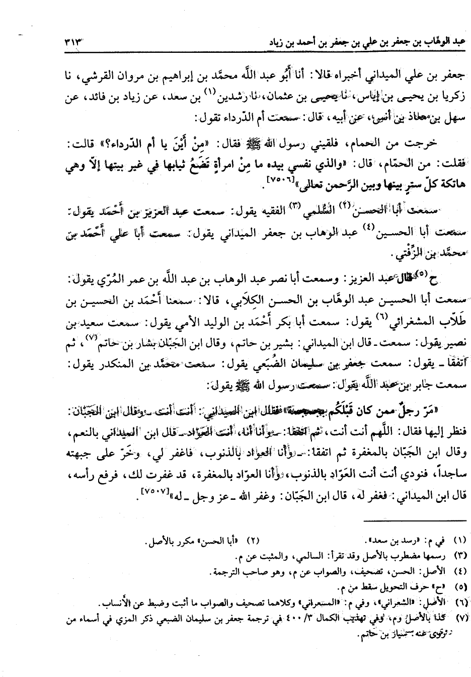 [7506] سمعت أبا الحسن (2) السلمي (3) الفقية يقول سمعت عبد العزيز بن أحمد يقول سمعت أبا الحسين (4) عبد الوهاب بن جعفر الميداني يقول سمعت أبا علي أحمد بن محمد بن الزفتي ح (5) قال عبد العزيز وسمعت أبا نصر عبد الوهاب بن عبد الله بن عمر المري يقول سمعت أبا الحسين عبد الوهاب بن الحسن الكلابي قالا سمعنا أحمد بن الحسين بن طلاب المشغرائي (6) يقول سمعت أبا بكر أحمد بن الوليد الأمي يقول سمعت سعيد بن نصير يقول سمعت قال ابن الميداني بشير بن حاتم وقال بن الجبان بشار بن حاتم (7) ثم اتفقا يقول سمعت جعفر بن سليمان الضبعي يقول سمعت محمد بن المنكدر يقول سمعت جابر بن عبد الله يقول سمعت رسول الله (صلى الله عليه وسلم) يقول مر رجل ممن كان قبلكم بجمجمة فقال ابن الميداني أنت أنت وقال ابن الجبان فنظر إليها فقال اللهم أنت أنت ثم اتفقا وأنا أنا أنت العواد قال ابن الميداني بالنعم وقال ابن الجبان بالمغفرة ثم اتفقا وأنا العواد بالذنوب فاغفر لي وخر على جبهته ساجدا فنودي أنت أنت العواد بالذنوب وأنا العواد بالمغفرة قد غفرت لك فرفع رأسه قال ابن الميداني فغفر له قال ابن الجبان وغفر الله عز وجل له