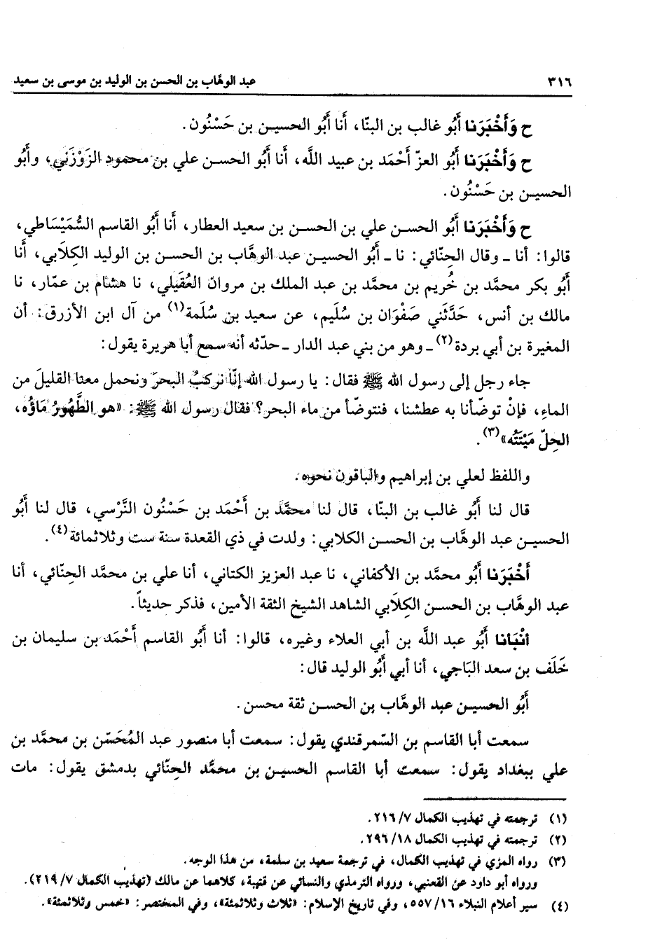 ح وأخبرنا أبو غالب بن البنا أنا أبو الحسين بن حسنون ح وأخبرنا أبو العز أحمد بن عبيد الله أنا أبو الحسن علي بن محمود الزوزني وابو الحسين بن حسنون ح وأخبرنا أبو الحسن الحسن علي بن الحسن بن سعيد العطار أنا أبو القاسم السميساطي قالوا أنا وقال الحنائي نا أبو الحسين عبد الوهاب بن الحسن بن الوليد الكلابي أنا أبو بكر محمد بن خريم بن محمد بن عبد الملك بن مروان العقيلي نا هشام بن عمار نا مالك بن أنس حدثني صفوان بن سليم عن سعيد بن سلمة (1) من آل ابن الأزرق ان المغيرة بن أبي بردة (2) وهو من بني عبد الدار حدثه أنه سمع أبا هريرة يقول جاء رجل إلى رسول الله (صلى الله عليه وسلم) فقال يا رسول الله إنا نركب البحر ونحمل معنا القليل من الماء فإن توضأنا به عطشنا فتتوضأ من ماء البحر فقال رسول الله (صلى الله عليه وسلم) هو الطهور ماؤه الحل ميتته (3) واللفظ لعلي بن إبراهيم والباقون نحوه قال لنا أبو غالب بن البنا قال لنا محمد بن أحمد بن حسنون النرسي قال لنا أبو الحسين عبد الوهاب بن الحسن الكلابي ولدت في ذي القعدة سنة ست وثلاثمائة (4) اخبرنا أبو محمد بن الأكفاني نا عبد العزيز الكتاني أنا علي بن محمد الحنائي أنا عبد الوهاب بن الحسن الكلابي الشاهد الشيخ الثقة الأمين فذكر حديثا أنبأنا أبو عبد الله بن أبي العلاء وغيره قالوا أنا أبو القاسم أحمد بن سليمان بن خلف بن سعد الباجي أنا أبي أبو الوليد قال أبو الحسين عبد الوهاب بن الحسن ثقة محسن سمعت أبا القاسم السمرقندي يقول سمعت أبا منصور عبد المحسن بن محمد بن علي ببغداد يقول سمعت أبا القاسم الحسين بن محمد الحنائي بدمشق يقول مات
