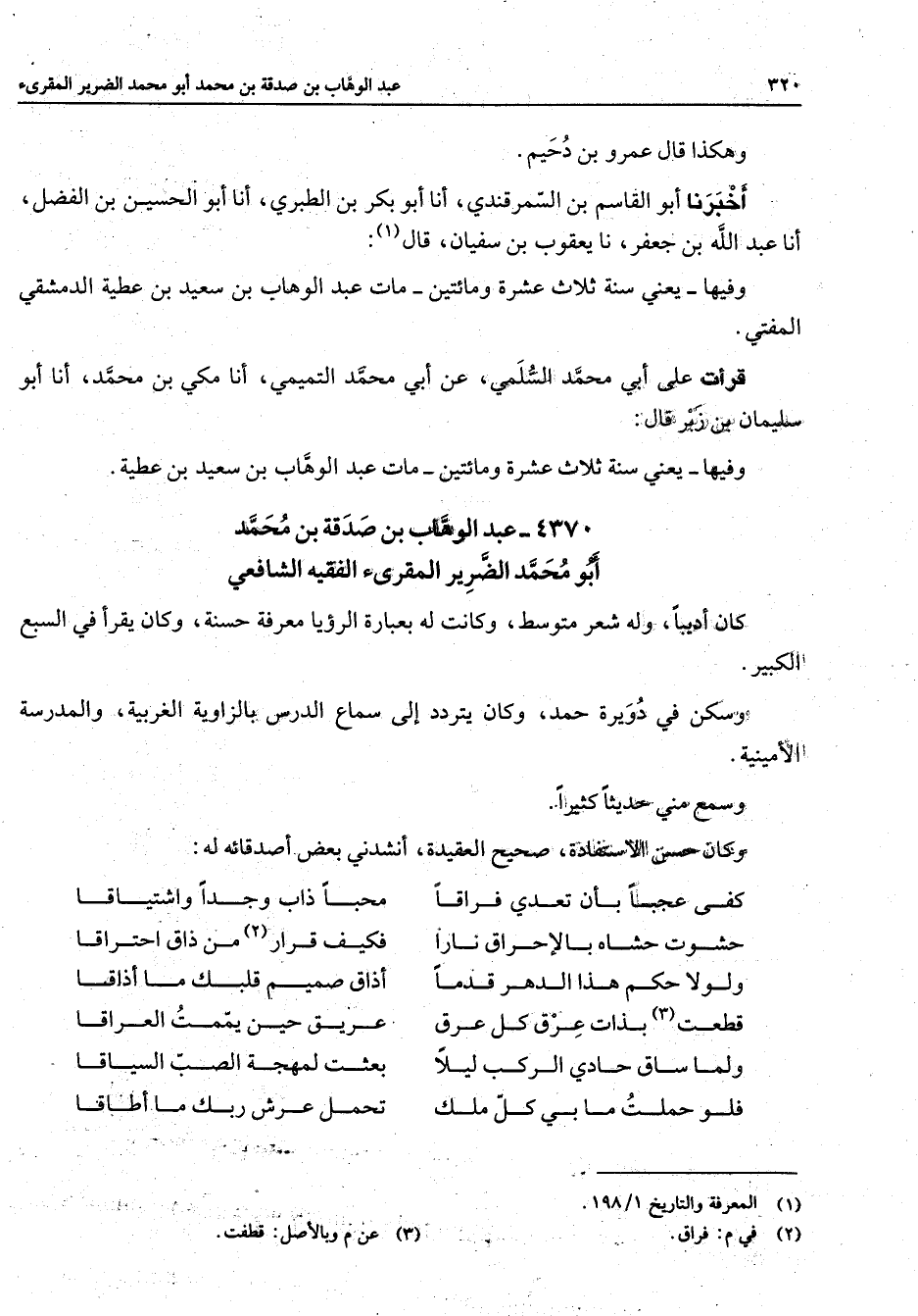 وهكذا قال عمرو بن دحيم أخبرنا أبو القاسم بن السمرقندي أنا أبو بكر بن الطبري أنا أبو الحسين بن الفضل أنا عبد الله بن جعفر نا يعقوب بن سفيان قال (1) وفيها يعني سنة ثلاث عشرة ومائتين مات عبد الوهاب بن سعيد بن عطية الدمشقي المفتي قرأت علي أبي محمد السلمي عن أبي محمد التيمي أنا مكي بن محمد نا أبو سليمان بن زبر قال وفيها يعني سنة ثلاث عشرة ومائتين مات عبد الوهاب بن سعيد بن عطية 4370 عبد الوهاب بن صدقة بن محمد أبو محمد الضرير المقرئ الفقية الشافعي كان أديبا وله شعر متوسط وكانت له بعبارة الرؤيا معرفة حسنة وكان يقرأ في السبع الكبير وسكن في دويره حمد وكان يتردد إلى سماع الدرس بالزاوية الغربية والمدرسة الأمينية وسمع مني حديثا كثيرا وكان حسن الاستفادة صحيح العقيدة أنشدني بعض أصدقائه له * كفى عجبا بان تعدي فراق * محبا ذاب وجدا واشتياقا حشوت حشاه بالإحراق نارا * فكيف قرار (2) من ذاق احتراما ولولا حكم هذا الدهر قدما * أذاق صميم قلبك ما أذاقا قطعت (3) بذات عرق كل عرق * عريق حين يممت العراق ولما ساق حادي الركب ليلا * بعثت لمهجة الصب السياقا فلو حملت ما بي كل ملك * تحمل عرش ربك ما أطاقا *