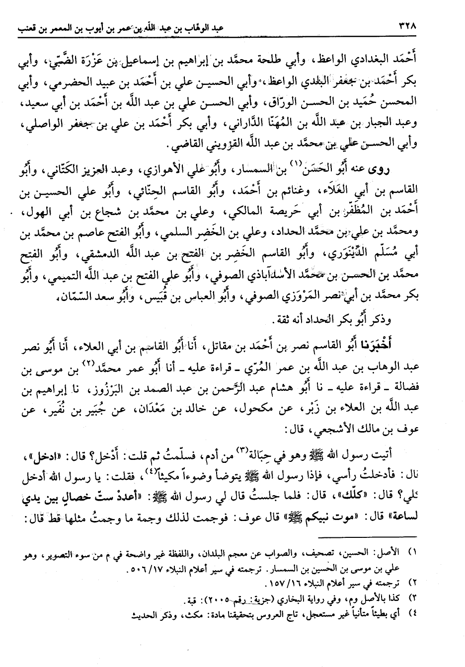 أحمد البغدادي الواعظ وأبي طلحة محمد بن إبراهيم بن إسماعيل بن عزرة الضبي وأبي بكر احمد بن جعفر البلدي الواعظ وأبي الحسين علي بن احمد بن عبيد الحضرمي وأبي المحسن حميد بن الحسن الوراق وأبي الحسن علي بن عبد الله بن أحمد بن أبي سعيد وعبد الجبار بن عبد الله بن المهنا الداراني وابي بكر أحمد بن علي بن جعفر الواصلي وأبي الحسن علي بن محمد بن عبد الله القزويني القاضي روى عنه أبو الحسن (1) بن السمسار وأبو علي الأهوازي وعبد العزيز الكتاني وأبو القاسم بن أبي العلاء وغنائم بن أحمد وأبو القاسم الحنائي وأبو علي الحسين بن احمد بن المظفر بن أبي حريصة المالكي وعلي بن محمد بن شجاع بن أبي الهول ومحمد بن علي بن محمد الحداد وعلي بن الخضر السلمي وابو الفتح عاصم بن محمد بن ابي مسلم الدينوري وابو القاسم الخضر بن الفتح بن عبد الله الدمشقي وأبو الفتح محمد بن الحسن بن محمد الأسد آباذي الصوفي وأبو علي الفتح بن عبد الله التميمي وأبو بكر محمد بن أبي نصر المروزي الصوفي وأبو العباس بن قبيس وأبو سعد السمان وذكر أبو بكر الحداد أنه ثقة أخبرنا أبو القاسم نصر بن مقاتل أنا أبو القاسم بن أبي العلاء أنا أبو نصر عبد الوهاب بن عبد الله بن عمر المري قراءة عليه أنا أبو عمر محمد (2) بن موسى بن فضالة قراءة عليه نا أبو هشام عبد الرحمن عبد الصمد بن البرزوز نا إبراهيم بن عبد الله بن العلاء بن زبر عن مكحول عن خالد بن معدان عن جبير بن نفير عن عوف بن مالك الأشجعي قال أتيت رسول الله (صلى الله عليه وسلم) وهو في حبالة (3) من أدم فسلمت ثم قلت أدخل قال ادخل قال فأدخلت رأسي فإذا رسول الله (صلى الله عليه وسلم) يتوضأ وضوءا مكيثا (4) فقلت يا رسول الله ادخل كلي قال كلك قال فلما جلست قال لي رسول الله (صلى الله عليه وسلم) أعدد ست خصال بين يدي لساعة قال موت نبيكم (صلى الله عليه وسلم) قال عوف فوجمت لذلك وجمة ما وجمت مثلها قط قال