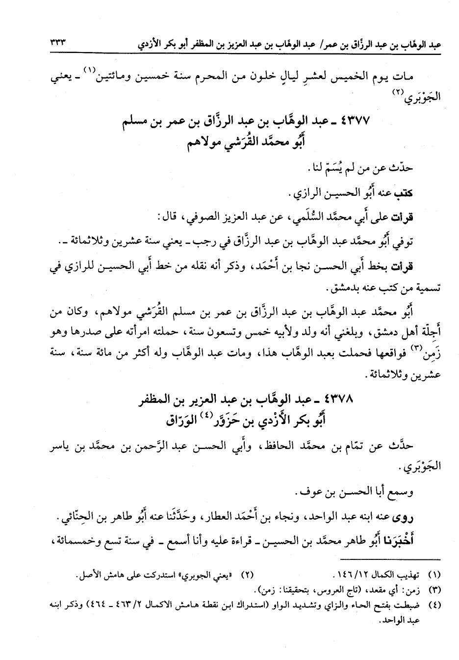 4378 - عبد الوهاب بن عبد العزيز بن المظفر أبو بكر الأزدي بن حزور (4) الوراق حدث عن تمام بن محمد الحافظ وأبي الحسن عبد الرحمن بن محمد بن ياسر الجوبري وسمع أبا الحسن بن عوف روى عنه ابنه عبد الواحد ونجاء بن أحمد العطار وحدثنا عنه أبو طاهر بن الحنائي أخبرنا أبو طاهر محمد بن الحسين قراءة عليه وأنا أسمع في سنة تسع وخمسمائة