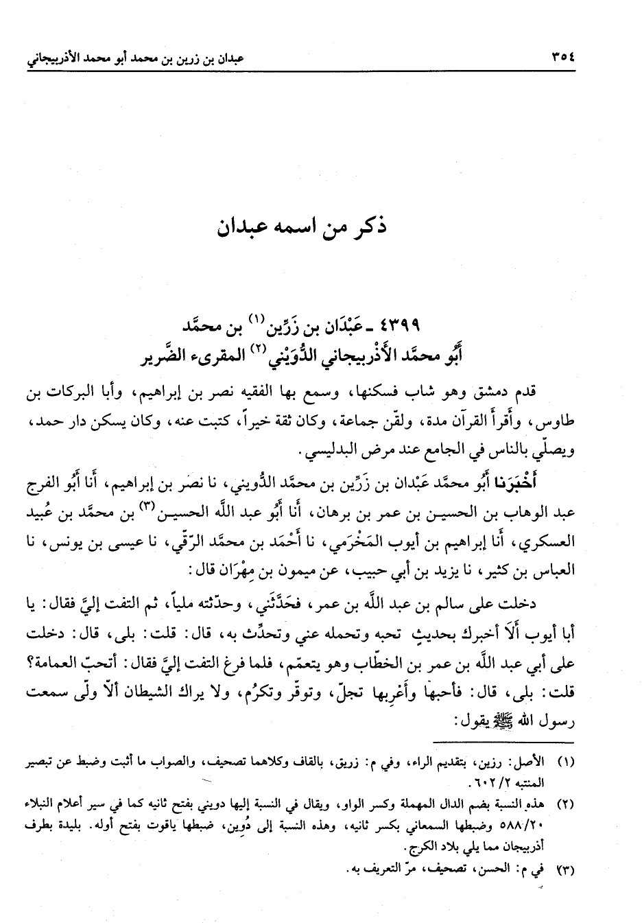" ذكر من اسمه عبدان " 4399 عبدان بن زرين (1) بن محمد أبو محمد الأذربيجاني الدويني (2) المقرئ الضرير قدم دمشق وهو شاب فسكنها وسمع بها الفقيه نصر بن إبراهيم وأبا البركات بن طاوس وأقرأ القرآن مدة ولقن جماعه وكان ثقة خيرا كتبت عنه وكان يسكن دار حمد ويصلي بالناس في الجامع عند مرض البدليسي أخبرنا أبو محمد عبدان بن زرين بن محمد الدويني نا نصر بن إبراهيم أنا أبو الفرج عبد الوهاب بن الحسين بن عمر بن برهان أنا أبو عبد الله الحسين (3) بن محمد بن عبيد العسكري أنا إبراهيم بن أيوب المخرمي نا أحمد بن محمد الرقي نا عيسى بن يونس نا العباس بن كثير نا يزيد بن أبي حبيب عن ميمون بن مهران قال دخلت على سالم بن عبد الله بن عمر فحدثني وحدثته مليا ثم التفت إلي فقال يا أبا أيوب ألا أخبرك بحديث تحبه وتحمله عني وتحدث به قال قلت بلى قال دخلت علي ابي عبد الله بن عمر بن الخطاب وهو يتعمم فلما فرغ التفت إلي فقال أتحب العمامة قلت بلى قال فأحبها وأعربها تجل وتوقر وتكرم ولا يراك الشيطان ألا ولي سمعت رسول الله (صلى الله عليه وسلم) يقول