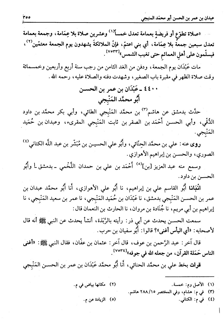 4400 - عبدان بن عمر بن الحسن أبو محمد المنبجي حدث بدمشق عن هاشم (3) بن محمد المنبجي الطائي وأبي بكر محمد بن داود الدقي وابي الحسن أحمد بن الصقر بن ثابت المنبجي المقرئ وعبدان بن حميد المنبجي روى عنه علي بن محمد الحنائي وابو علي الحسين بن مبشر بن عبد الله الكتاني (4) الصوري والحسن بن إبراهيم الأهوازي وسمع منه عبد العزيز بن (5) أحمد بن علي بن حمدان اللخمي بدمشق وأبو الحسن بن داود أنبأنا أبو القاسم علي بن إبراهيم نا أبو علي الأهوازي أنا أبو محمد عبدان بن عمر بن الحسن المنبجي بدمشق نا عبدان بن حميد المنجبي نا عمر بن سعيد المنبجي نا إبراهيم بن ابي مريم نا جنادة بن مروان نا الحارث بن النعمان قال سمعت الحسن يحدث عن أبي ذر رأيته بالربذة أنشأ يحدث عن النبي (صلى الله عليه وسلم) أنه قال لأصحابه أي اليأس أغنى قالوا أبو سفيان بن حرب قال آخر عبد الرحمن بن عوف قال آخر عثمان بن عفان فقال النبي (صلى الله عليه وسلم) أغني الناس حملة القرآن من جعله الله في جوفه