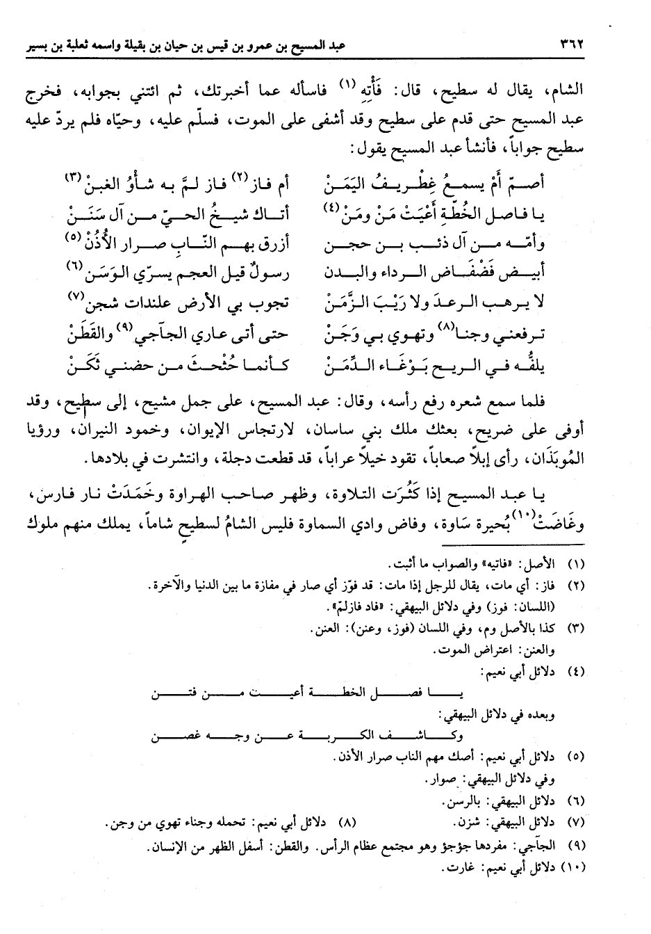 الشام يقال له سطيح قال فأته (1) فاسأله عما أخبرتك ثم ائتني بجوابه فخرج عبد المسيح حتى قدم على سطيح وقد أشفى على الموت فسلم عليه وحياه فلم يرد عليه سطيح جوابا فأنشأ عبد المسيح يقول * أصم أم يسمع غطريف اليمن * أم فاز (2) فار لم به شأو الغبن (3) يا فاصل الخطة أعيت من ومن (4) * أتاك شيخ الحي من آل سنن وأمه من آل ذئب بن حجن * أزرق بهم الناب صرار الأذن (5) أبيض فضفاض الرداء والبدن * رسول قيل العجم يسري الوسن (6) لا يرهب الرعد ولا ريب الزمن * تجوب بي الأرض علندات شجن (7) ترفعني وجنا (8) وتهوي بي وجن * حتى أتى عاري الجاجي (9) والقطن يلفه في الريح بوغاء الدمن * كأنما حثحث من حضني ثكن * فلما سمع شعره رفع رأسه وقال عبد المسيح على جمل مشيح إلى سطيح وقد أوفى على ضريح بعثك ملك بني ساسان لارتجاس الإيوان وخمود النيران ورؤيا الموبذان رأى إبلا صعابا تقود خيلا عرابا قد قطعت دجلة وانتشرت في بلادها يا عبد المسيح إذا كثرت التلاوة وظهر صاحب الهراوة وخمدت نار فارس وغاضت (10) بحيرة ساوة وفاض وادي السماوة فليس الشام لسطيح شاما يملك منهم ملوك