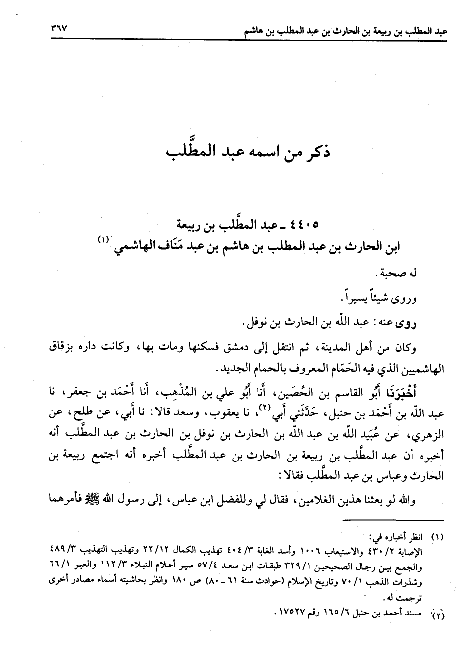 4405 - عبد المطلب بن ربيعة ابن الحارث بن عبد المطلب بن هاشم بن عبد مناف الهاشمي (1) له صحبة وروى شيئا يسيرا روى عنه عبد الله بن الحارث بن نوفل وكان من اهل المدينة ثم انتقل إلى دمشق فسكنها ومات بها وكانت داره بزقاق الهاشميين الذي فيه الحمام المعروف بالحمام الجديد أخبرنا أبو القاسم بن الحصين أنا أبو علي بن المذهب أنا أحمد بن جعفر نا عبد الله بن أحمد بن حنبل حدثني أبي (2) نا يعقوب وسعد قالا نا ابي عن طلح عن الزهري عن عبيد الله بن عبد الله بن الحارث بن نوفل بن الحارث بن عبد المطلب أنه أخبره أن عبد المطلب بن ربيعة بن الحارث بن عبد المطلب اخبره أنه اجتمع ربيعة بن الحارث وعباس بن عبد المطلب فقالا والله لو بعثنا هذين الغلامين فقال لي وللفضل ابن عباس إلى رسول الله (صلى الله عليه وسلم) فأمرهما