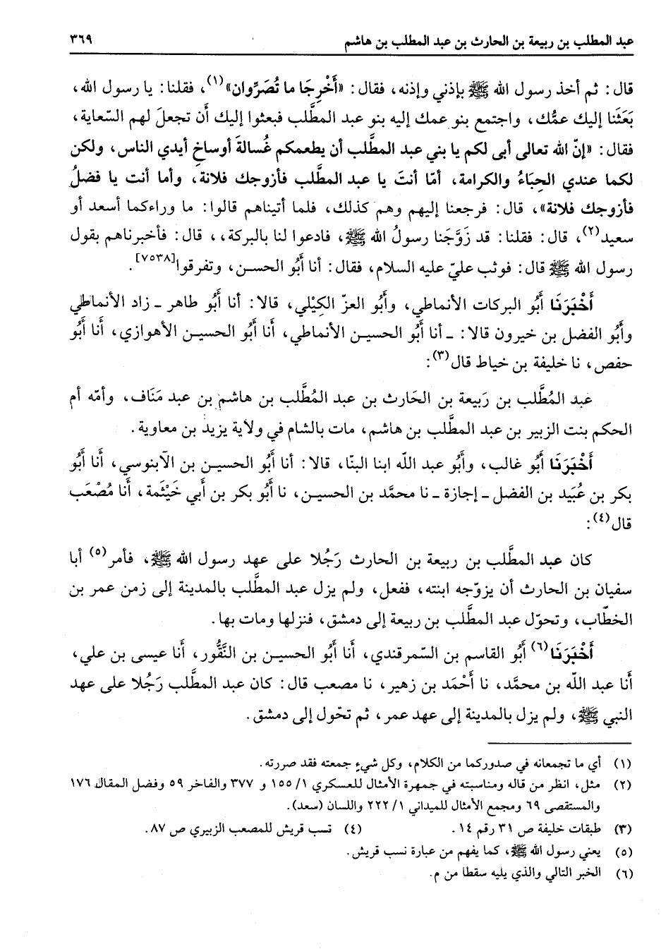 [7538] قال فرجعنا إليهم وهم كذلك فلما أتيناهم قالوا ما وراءكما أسعد أو سعيد (2) قال فقلنا قد زوجنا رسول الله (صلى الله عليه وسلم) فادعوا لنا بالبركة قال فاخبرناهم بقول رسول الله (صلى الله عليه وسلم) قال فوثب علي عليه السلام فقال أنا أبو الحسن وتفرقوا أخبرنا أبو البركات الأنماطي وأبو العز الكيلي قالا أنا أبو طاهر زاد الأنماطي وأبو الفضل بن خيرون قالا أنا أبو الحسين الأنماطي أنا أبو الحسين الأهوازي أنا أبو حفص نا خليفة بن خياط قال (3) عبد المطلب بن ربيعة بن الحارث بن عبد المطلب بن هاشم بن عبد مناف وأمه أم الحكم بنت الزبير بن عبد المطلب بن هاشم مات بالشام في ولاية يزيد بن معاوية أخبرنا أبو غالب وأبو عبد الله ابنا البنا قالا أنا أبو الحسين بن الآبنوسي أنا أبو بكر بن عبيد بن الفضل إجازة نا محمد بن الحسين نا أبو بكر بن ابي خيثمة أنا مصعب قال (4) كان عبد المطلب بن ربيعة بن الحارث رجلا على عهد رسول الله (صلى الله عليه وسلم) فامر (5) أبا سفيان بن الحارث أن يزوجه ابنته ففعل ولم يزل عبد المطلب بالمدينة إلى زمن عمر بن الخطاب وتحول عبد المطلب بن ربيعة إلى دمشق فنزلها ومات بها أخبرنا (6) أبو القاسم بن السمرقندي أنا أبو الحسين بن النقور أنا عيسى بن علي أنا عبد الله بن محمد نا أحمد بن زهير نا مصعب قال كان عبد المطلب رجلا على عهد النبي (صلى الله عليه وسلم) ولم يزل بالمدينة إلى عهد عمر ثم تحول إلى دمشق