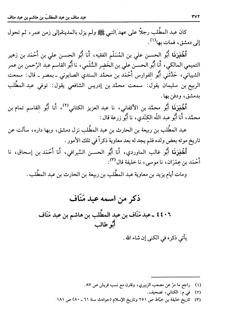 كان عبد المطلب رجلا على عهد النبي (صلى الله عليه وسلم) ولم يزل بالمدينة إلى زمن عمر ثم تحول إلى دمشق فمات بها (1) أخبرنا أبو الحسن علي بن المسلم الفقية أنا أبو الحسن علي بن أحمد بن زهير التميمي المالكي أنا أبو الحسن علي بن الخضر السلمي نا أبو القاسم عبد الرحمن بن عمر الشيباني حدثني أبو الفوارس أحمد بن محمد السندي الصابوني بمصر قال سمعت الربيع بن سليمان يقول سمعت محمد بن إدريس الشافعي يقول توفي عبد المطلب بدمشق ودفن بها أخبرنا أبو محمد بن الأكفاني نا عبد العزيز الكتاني (2) أنا أبو القاسم تمام بن محمد أنا أبو عبد الله الكندي نا أبو زرعة قال عبد المطلب بن ربيعة بن الحارث بن عبد المطلب نزل دمشق وبها داره سألت عن تاريخ موته بعض ولده فلم يجد له بعد معاوية ذكرا في تلك الأمور أخبرنا أبو غالب الماوردي أنا أبو الحسن السيرافي أنا أحمد بن إسحاق نا أحمد بن عمران نا موسى نا خليفة قال (3) ومات أيام يزيد بن معاوية عبد المطلب بن ربيعة بن الحارث بن عبد المطلب " ذكر من اسمه عبد مناف "