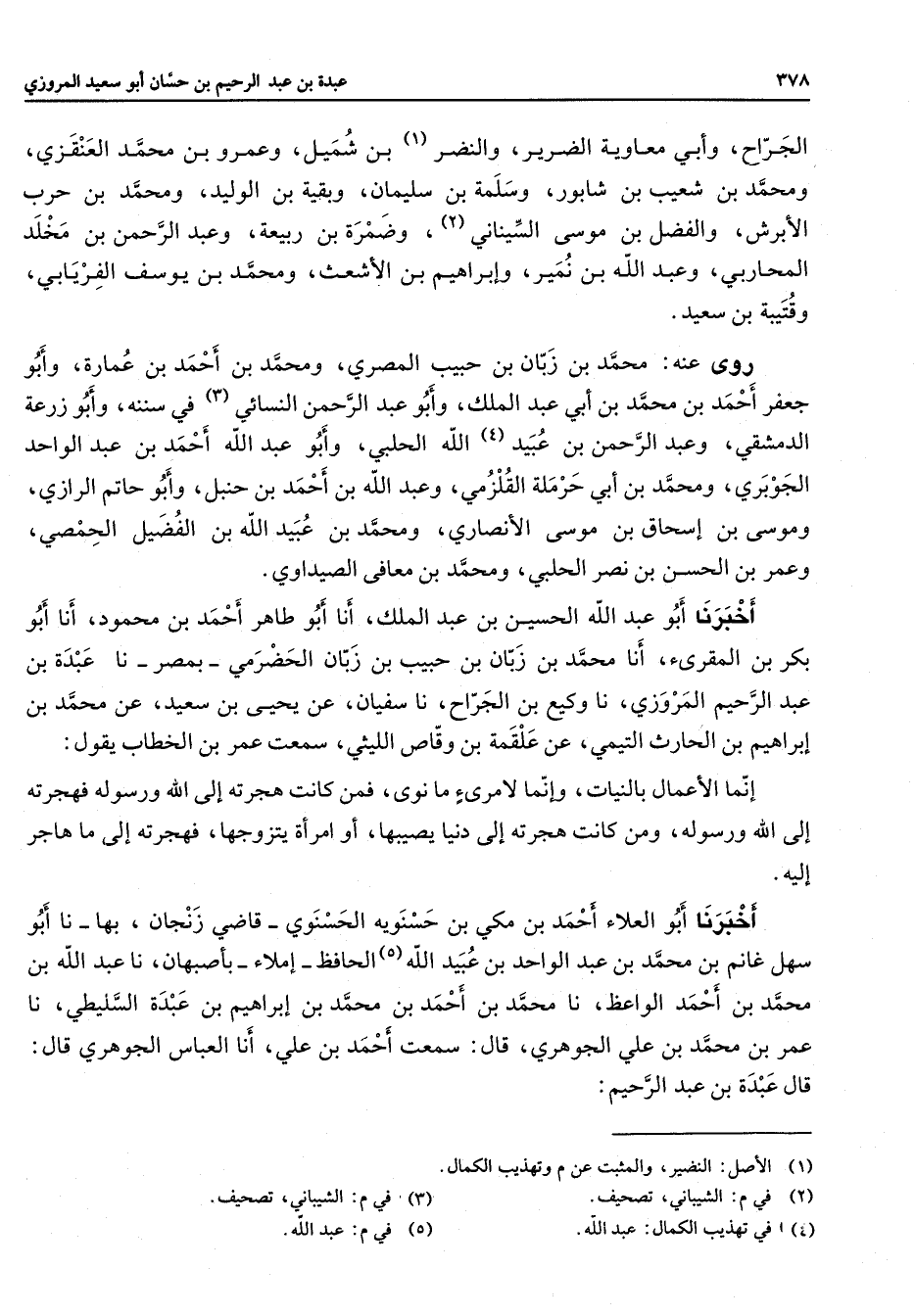 الجرح وأبي معاوية الضرير والنضر (1) بن شميل وعمرو بن محمد العنقزي ومحمد بن شعيب بن شابور وسلمة بن سليمان وبقية بن الوليد ومحمد بن حرب الأبرش والفضل بن موسى السيناني (2) وضمرة بن ربيعة وعبد الرحمن بن مخلد المحاربي وعبد الله بن نمير وإبراهيم بن الأشعث ومحمد بن يوسف الفريابي وقتيبة بن سعيد روى عنه محمد بن زبان بن حبيب المصري ومحمد بن أحمد بن عمارة وابو جعفر أحمد بن محمد بن أبي عبد الملك وأبو عبد الرحمن النسائي (3) في سننه وأبو زرعة الدمشقي وعبد الرحمن بن عبيد (4) الله الحلبي وأبو عبد الله أحمد بن عبد الواحد الجوبري ومحمد بن أبي حرملة القلزمي وعبد الله بن أحمد بن حنبل وأبو حاتم الرازي وموسى بن إسحاق بن موسى الأنصاري ومحمد بن عبيد الله بن الفضيل الحمصي وعمر بن الحسن بن نصر الحلبي ومحمد بن معافى الصيداوي أخبرنا أبو عبد الله الحسين بن عبد الملك أنا أبو طاهر أحمد بن محمود أنا أبو بكر بن المقرئ أنا محمد بن زبان بن حبيب بن زبان الحضرمي بمصر نا عبدة بن عبد الرحيم المروزي نا وكيع بن الجراح نا سفيان عن يحيى بن سعيد عن محمد بن إبراهيم بن الحارث التيمي عن علقمة بن وقاص الليثي سمعت عمر بن الخطاب يقول إنما الأعمال بالنيات وإنما لأمرئ ما نوى فمن كانت هجرته إلى الله ورسوله فهجرته إلى الله ورسوله ومن كانت هجرته إلى دنيا يصيبها أو امرأة يتزوجها فهجرته إلى ما هاجر إليه أخبرنا أبو العلاء أحمد بن مكي بن حسنوية الحسنوي قاضي زنجان بها نا أبو سهل غانم بن محمد بن عبد الواحد بن عبيد الله (5) الحافظ إملاء بأصبهان نا عبد الله بن محمد بن أحمد الواعظ نا محمد بن أحمد بن محمد بن إبراهيم بن عبدة السليطي نا عمر بن محمد بن علي الجوهري قال سمعت أحمد بن علي أنا العباس الجوهري قال قال عبده بن عبد الرحيم
