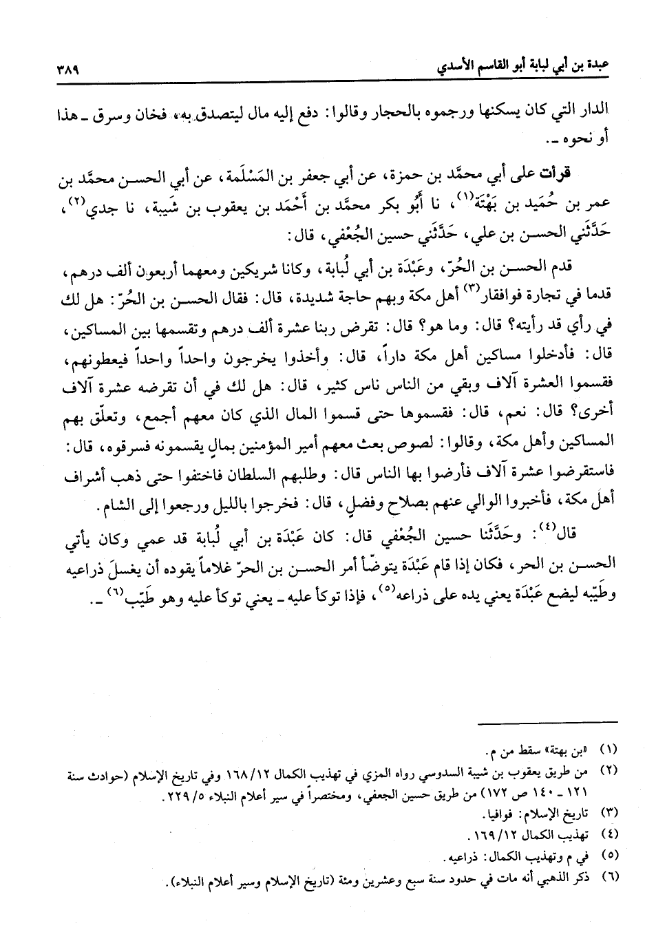 الدار التي كان يسكنها ورجموه بالحجار وقالوا دفع إليه مال ليتصدق به فخان وسرق هذا أو نحوه قرأت على أبي محمد بن حمزة عن أبي جعفر بن المسلمة عن أبي الحسن محمد بن عمر بن حميد بن بهتة (1) نا أبو بكر محمد بن أحمد بن يعقوب بن شيبة نا جدي (2) حدثني الحسن بن علي حدثني حسين الجعفي قال قدم الحسن بن الحر وعبدة بن أبي لبابة وكانا شريكين ومعهما أربعون ألف درهم قدما في تجارة فوافقار (3) أهل مكة وبهم حاجة شديدة قال فقال الحسن بن الحر هل لك في رأي قد رأيته قال وما هو قال تقرض ربنا عشرة ألف درهم وتقسمها بين المساكين قال فأدخلوا مساكين أهل مكة دارا قال وأخذوا يخرجون واحدا واحدا فيعطونهم فقسموا العشرة آلاف وبقي من الناس ناس كثير قال هل لك في أن تقرضه عشرة آلاف أخرى قال نعم قال فقسموها حتى قسموا المال الذي كان معهم أجمع وتعلق بهم المساكين وأهل مكة وقالوا لصوص بعث معهم أمير المؤمنين بمال يقسمونه فسرقوه قال فاستقرضوا عشرة آلاف فأرضوا بها الناس قال وطلبهم السلطان فاختفوا حتى ذهب أشراف أهل مكة فأخبروا الوالي عنهم بصلاح وفضل قال فخرجوا بالليل ورجعوا إلى الشام قال (4) وحدثنا حسين الجعفي قال كان عبدة بن أبي لبابة قد عمي وكان يأتي الحسن بن الحر فكان إذا قام عبدة يتوضأ أمر الحسن بن الحر غلاما يقوده أن يغسل ذراعية وطيبة ليضع عبدة يعني يده على ذراعه (5) فإذا توكأ عليه يعني توكأ عليه وهو طيب (6)