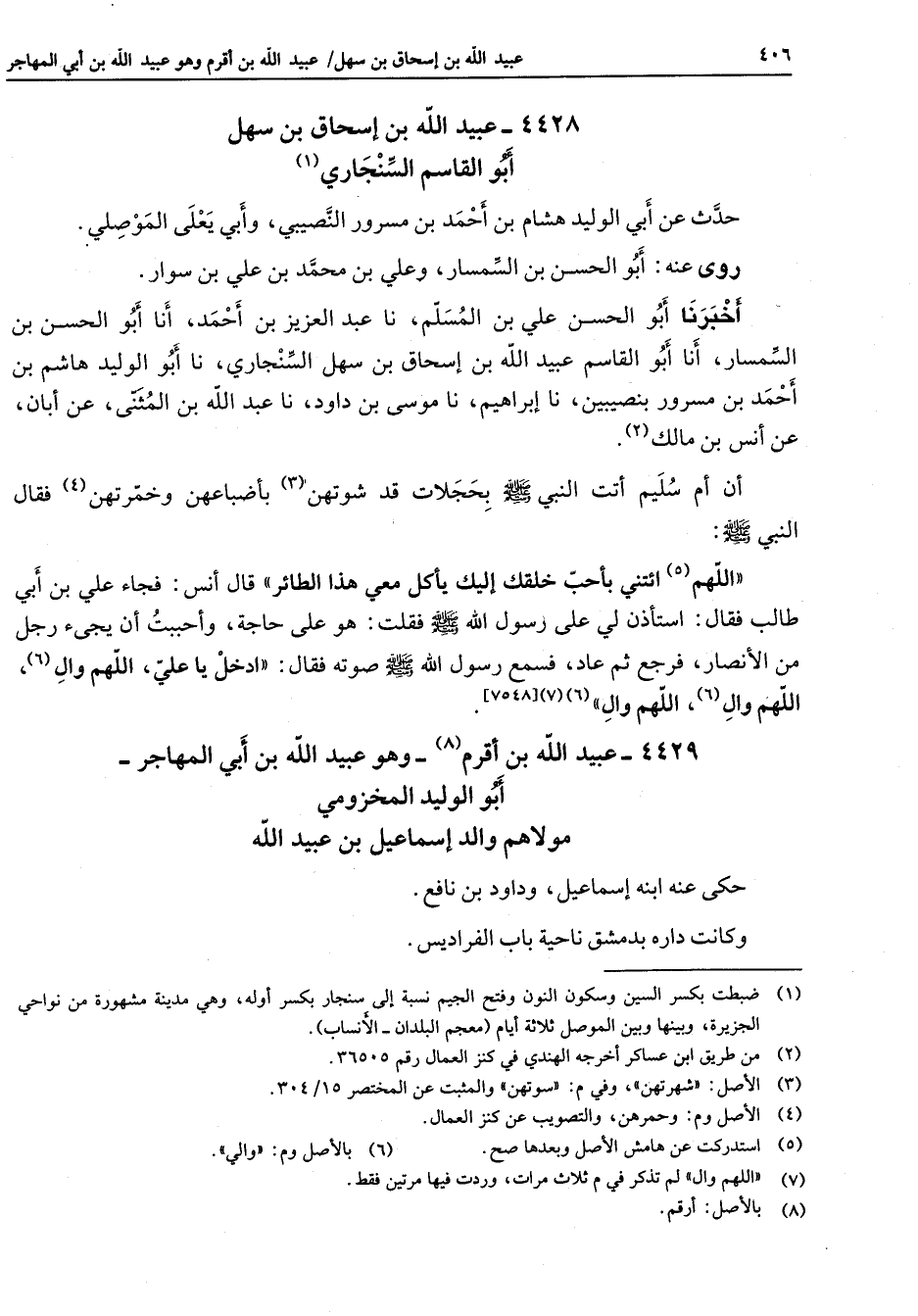 4428 - عبيد الله بن إسحاق بن سهل أبو القاسم السنجاري (1) حدث عن أبي الوليد هشام بن أحمد بن مسرور النصيبي وأبي يعلى الموصلي روى عنه أبو الحسن بن السمسار وعلي بن محمد بن علي بن سوار اخبرنا أبو الحسن علي بن المسلم نا عبد العزيز بن أحمد أنا أبو الحسن بن السمسار أنا أبو القاسم عبيد الله بن إسحاق بن سهل السنجاري نا أبو الوليد هاشم بن أحمد بن مسرور بنصيبين نا إبراهيم نا موسى بن داود نا عبد الله بن المثنى عن أبان عن أنس بن مالك (2) أن أم سليم أتت النبي (صلى الله عليه وسلم) بحجلات قد شوتهن (3) بأضباعهن وخمرتهن (4) فقال النبي (صلى الله عليه وسلم) اللهم (5) ائتني باحب خلقك إليك يأكل معي هذا الطائر قال أنس فجاء علي بن أبي طالب فقال استأذن لي علي رسول الله (صلى الله عليه وسلم) فقلت هو علي حاجة وأحببت أن يجئ رجل من الأنصار فرجع ثم عاد فسمع رسول الله (صلى الله عليه وسلم) صوته فقال ادخل يا علي اللهم وال (6) اللهم وال اللهم وال (6)