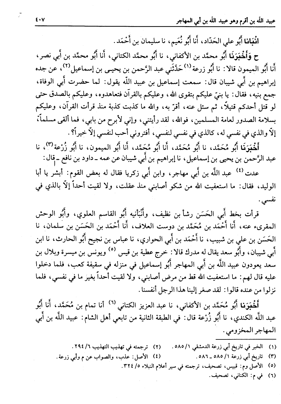 أنبأنا أبو علي الحداد أنا أبو نعيم نا سليمان بن أحمد ح وأخبرنا أبو محمد بن الأكفاني نا أبو محمد الكتاني أنا أبو محمد بن أبي نصر أنا أبو الميمون قالا نا أبو زرعة (1) حدثني عبد الرحمن بن يحيى بن إسماعيل (2) عن جده إبراهيم بن أبي شيبان قال سمعت إسماعيل بن عبيد الله يقول لما حضرت أبي الوفاة جمع بنيه فقال يا بني عليكم بتقوى الله وعليكم بالقرآن فتعاهدوه وعليكم بالصدق حتى لو قتل أحدكم قتيلا ثم سئل عنه أقر به والله ما كذبت كذبة منذ قرأت القرآن وعليكم بسلامة الصدور لعامة المسلمين فوالله لقد رأيتني وإني لأبرح من بابي فما ألقى مسلما إلا والذي في نفسي له كالذي في نفس لنفسي أفتروني أحب لنفسي إلا خيرا أخبرنا أبو محمد نا أبو محمد أنا أبو محمد أنا أبو الميمون نا أبو زرعة (3) أنا عبد الرحمن بن يحيى بن إسماعيل نا إبراهيم بن أبي شيبان عن عمه داود بن نافع قال عدت (4) عبد الله بن أبي مهاجر وابن أبي زكريا فقال له بعض القوم أبشر يا أبا الوليد فقال ما استعفيت الله من شكو أصابني منذ عقلت ولا لقيت أحدا إلا بالذي في نفسي قرأت بخط أبي الحسن رشأ بن نظيف وأبنائه أبو القاسم العلوي وأبو الوحش المقرئ عنه أنا أحمد بن محمد بن دوست العلاف أنا أحمد بن الحسن بن سلمان نا الحسن بن علي بن شبيب نا أحمد بن أبي الحوراي نا عباس بن نجيح أبو الحارث نا ابن أبي شيبان وأبو سعد يقال له مدرك قالا خرج عطية بن قيس (5) ويونس بن ميسرة وبلال بن سعد يعودون بيد الله بن أبي المهاجر أبو إسماعيل في منزله في سقيفه كعب فلما دخلوا عليه قال لهم ما استعفيت الله قط من مرض أصابني ولا لقيت أحدا بغير ما في نفسي فلما نزلوا من عنده قالوا لقد صغر إلينا هذا الرجل أنفسنا أخبرنا أبو محمد بن الأكفاني نا عبد العزيز الكتاني (6) أنا تمام بن محمد أنا أبو عبد الله الكندي نا أبو زرعة قال في الطبقة الثانية من تابعي أهل الشام عبيد الله بن أبي المهاجر المخزومي