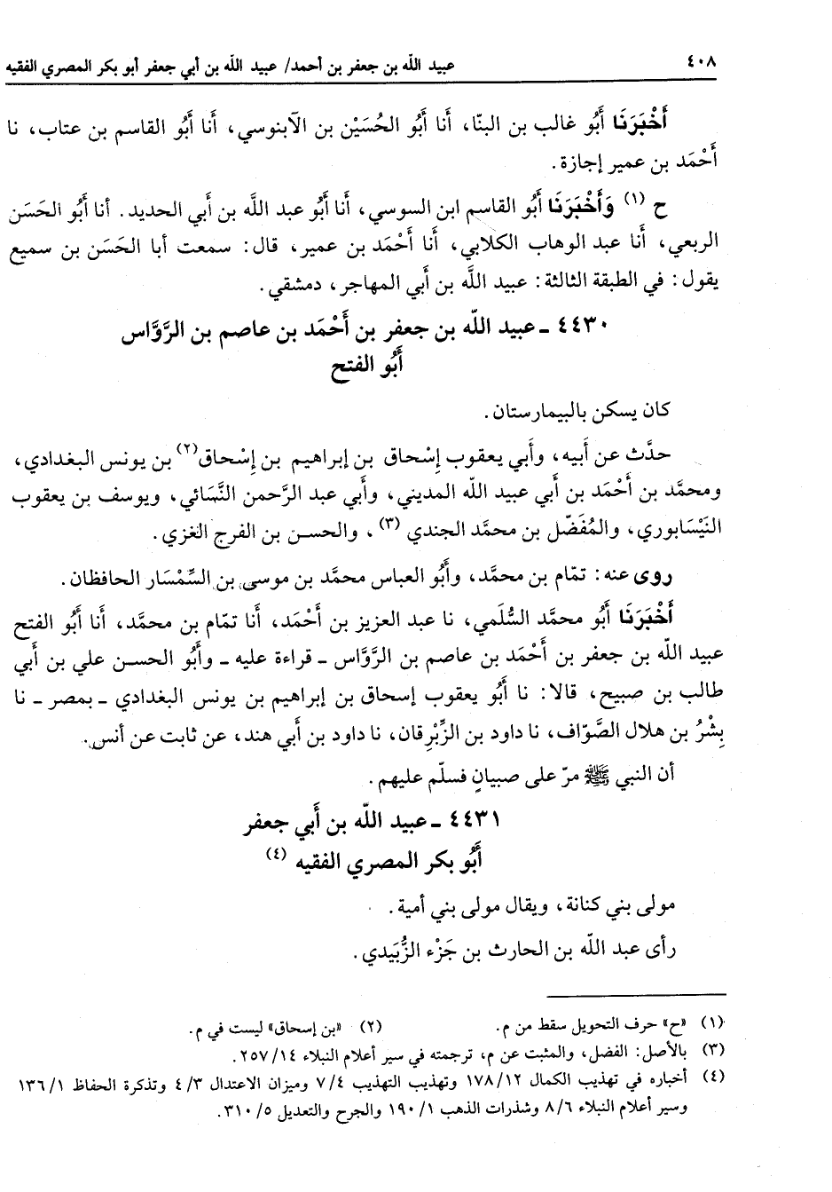 4430 - عبيد الله بن جعفر بن أحمد بن عاصم بن الرواس أبو الفتح كان يسكن بالبيمارستان حدث عن أبيه وأبي يعقوب إسحاق بن إبراهيم بن إسحاق (2) بن يونس بن البغدادي ومحمد بن أحمد بن أبي عبيد الله المديني وأبي عبد الرحمن النسائي ويوسف بن يعقوب النيسابوري والمفضل بن محمد الجندي (3) والحسن بن الفرج الغزي روى عنه تمام بن محمد وأبو العباس محمد بن موسى بن السمسار الحافظان أخبرنا أبو محمد السلمي نا عبد العزيز بن أحمد أنا تمام بن محمد أنا أبو الفتح عبيد الله بن جعفر بن أحمد بن عاصم بن الرواس قراءة عليه وأبو الحسن علي بن أبي طالب بن صبيح قالا نا أبو يعقوب إسحاق بن إبراهيم بن يونس البغدادي بمصر نا بشر بن هلال الصواف نا على داود بن الزبرقان نا داود بن أبي هند عن ثابت عن أنس أن النبي (صلى الله عليه وسلم) مر صبيان فسلم عليهم