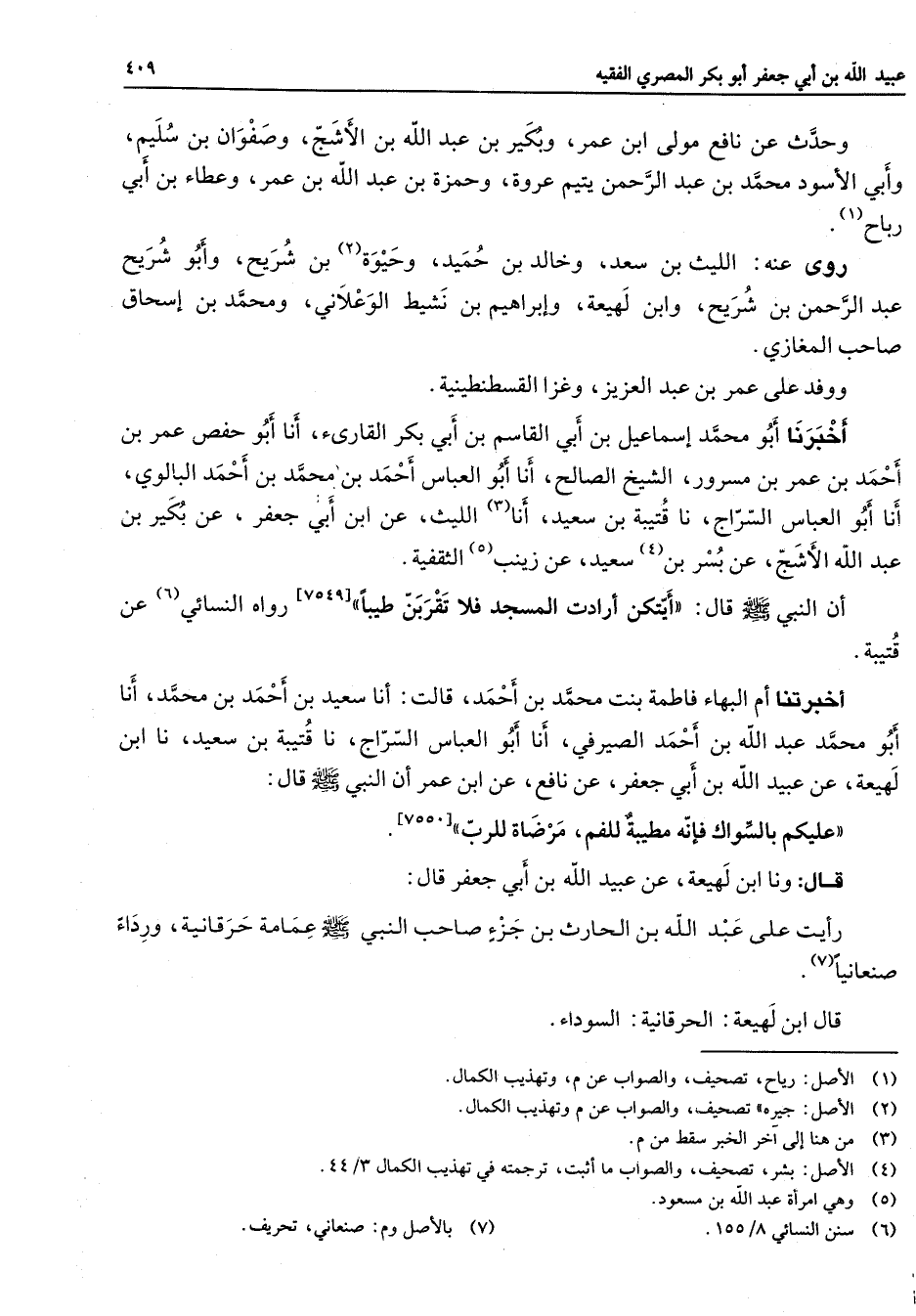 [7549] رواه النسائي (6) عن قتيبة أخبرتنا أم البهاء فاطمة بنت محمد بن أحمد قالت أنا سعيد بن أحمد بن محمد أنا أبو محمد عبد الله بن أحمد الصيرفي أنا أبو العباس السراج نا قتيبة بن سعيد نا ابن لهيعة عن عبيد الله بن أبي جعفر عن نافع عن ابن عمر أن النبي (صلى الله عليه وسلم) قال عليكم بالسواك فإنه مطيبة للفم مرضاة للرب