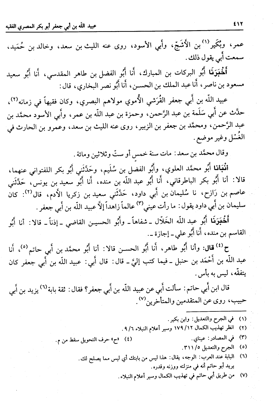 عمر وبكير (1) بن الأشج وأبي الأسود روى عنه الليث بن سعد وخالد بن حميد سمعت أبي يقول ذلك أخبرنا أبو البركات بن المبارك أنا أبو الفضل بن طاهر المقدسي أنا أبو سعيد مسعود بن ناصر انا عبد الملك بن الحسن أنا أبو نصر البخاري قال عبيد الله بن أبي جعفر القرشي الأموي مولاهم البصري وكان فقيها في زمانه (2) حدث عن أبي سلمة بن عبد الرحمن وحمزة بن عبد الله بن عمر وابي الأسود محمد بن عبد الرحمن ومحمد بن جعفر بن الزبير روى عنه الليث بن سعد وعمرو بن الحارث في الغسل وغير موضع وقال محمد بن سعد مات سنة خمس أو ست وثلاثين ومائة أنبأنا أبو محمد العلوي وأبو الفضل بن سليم وحدثني أبو بكر اللفتواني عنهما قالا أنا أبو بكر الباطرقاني أنا أبو عبد الله بن مندة أنا أبو سعيد بن يونس حدثني عاصم بن رازح نا سليمان بن أبي داود حدثني سعيد بن زكريا الأدم قال (2) كان سليمان بن أبي داود يقول ما رأت عيني (3) عالما زاهدا إلا عبيد الله بن أبي جعفر أخبرنا أبو عبد الله الخلال شفاها وأبو الحسين القاضي إذنا قالا أنا أبو القاسم بن مندة أنا أبو علي إجازة ح (4) قال وأنا أبو طاهر أنا أبو الحسن قالا أنا أبو محمد بن أبي حاتم (5) أنا عبد الله بن أحمد بن حنبل فيما كتب إلي قال قال أبي عبيد الله بن أبي جعفر كان يتفقه ليس به بأس قال ابن أبي حاتم سألت أبي عن عبيد الله بن أبي جعفر فقال ثقة بابة (6) يزيد بن أبي حبيب روى عن المتقدمين والمتأخرين (7)