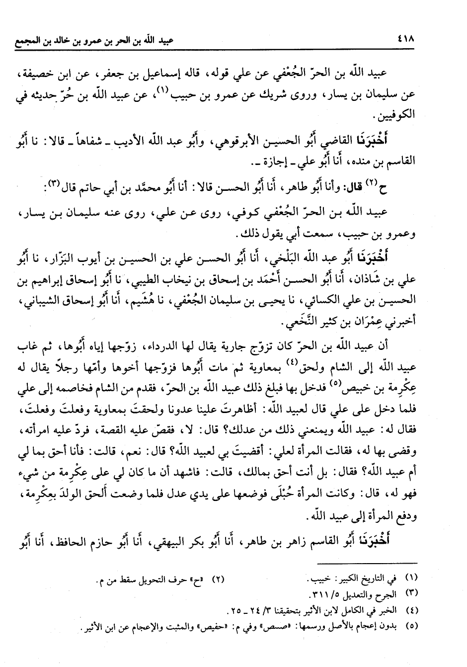 عبيد الله بن الحر الجعفي عن علي قوله قاله إسماعيل بن جعفر عن ابن خصيفة عن سليمان بن يسار وروى شريك عن عمرو بن حبيب (1) عن عبيد الله بن حر حديثه في الكوفيين أخبرنا القاضي أبو الحسين الأبرقوهي وأبو عبد الله الأديب شفاها قالا نا أبو القاسم بن مندة أنا أبو علي إجازة ح (2) قال وأنا أبو طاهر أنا أبو الحسن أنا أبو محمد بن أبي حاتم قال (3) عبيد الله بن الحر الجعفي كوفي روى عن علي روى عنه سليمان بن يسار وعمرو بن حبيب سمعت أبي يقول ذلك أخبرنا أبو عبد الله البلخي أنا أبو الحسن علي بن الحسين بن أيوب البزار نا أبو علي بن شاذان أنا أبو الحسن أحمد بن إسحاق بن نيخاب الطيبي نا أبو إسحاق إبراهيم بن الحسين بن علي الكسائي نا يحيى بن سليمان الجعفي نا هشيم أنا أبو إسحاق الشيباني أخبرني عمران بن كثير النخعي أن عبيد الله بن الحر كان تزوج جارية يقال لها الدرداء زوجها أياه أبوها ثم غاب عبيد الله إلى الشام ولحق (4) بمعاوية ثم مات أبوها فزوجها أخوها وأمها رجلا يقال له عكرمة بن خبيص (5) فدخل بها فبلغ ذلك عبيد الله بن الحر فقدم من الشام فخاصمه إلى علي فلما دخل علي علي قال لعبيد الله أظاهرت علينا عدونا ولحقت بمعاوية وفعلت وفعلت فقال له عبيد الله ويمنعني ذلك من عدلك قال لا فقص عليه القصة فرد عليه امرأته وقضى بها له فقال المرأة لعلي أقضيت بي لعبيد الله قال نعم قالت فأنا أحق بما لي أم عبيد الله فقال بل أنت أحق بمالك قالت فاشهد أن ما كان لي على عكرمة من شئ فهو له قال وكانت المرأة حبلى فوضعها على يدي عدل فلما وضعت ألحق الولد بعكرمة ودفع المرأة إلى عبيد الله أخبرنا أبو القاسم زاهر بن طاهر أنا أبو بكر البيهقي أنا أبو حازم الحافظ أنا أبو