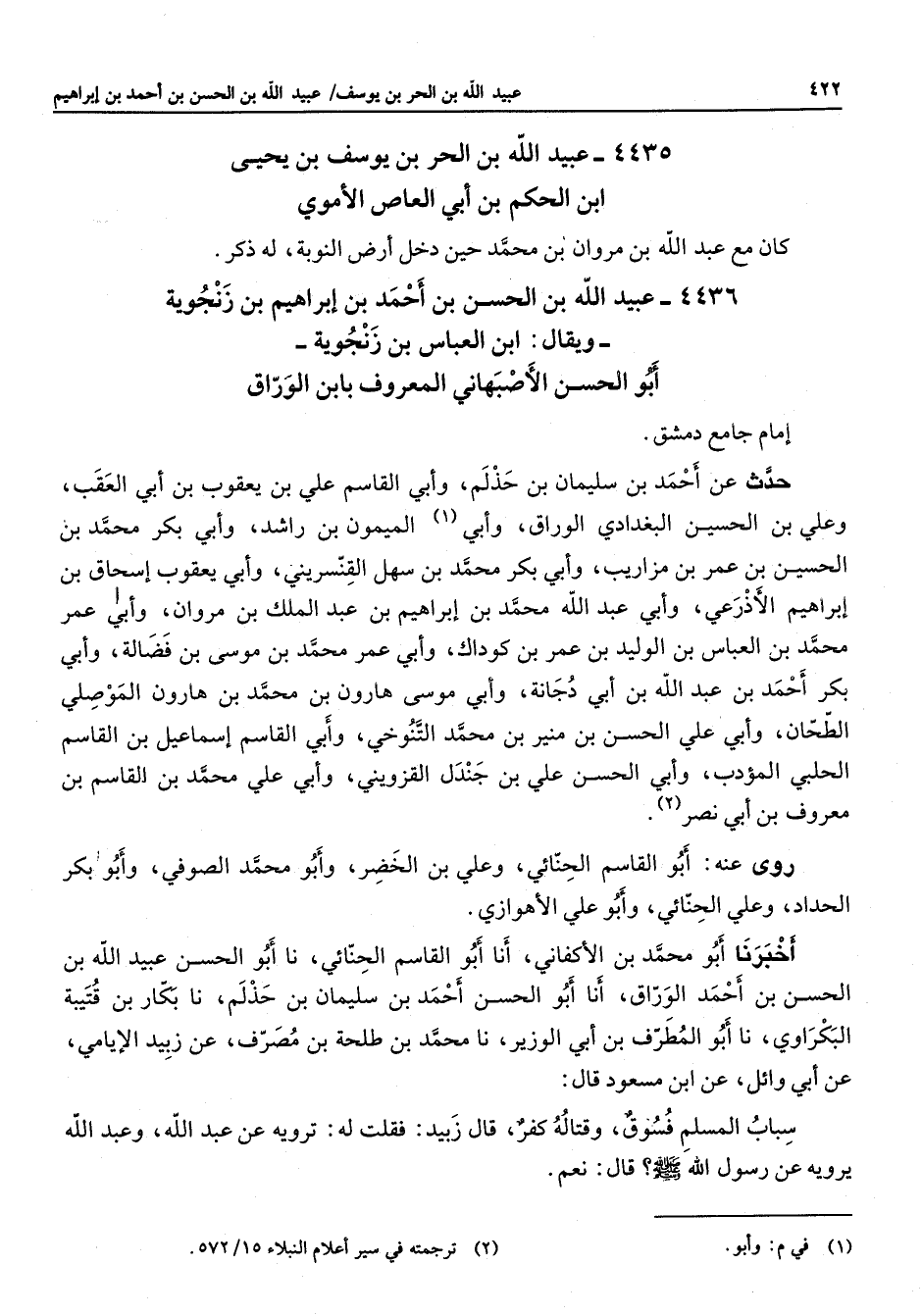 4436 - عبيد الله بن الحسن بن أحمد بن إبراهيم بن إبراهيم بن زنجوية ويقال ابن العباس بن زنجوية أبو الحسن الأصبهاني المعروف بابن الوراق إمام جامع دمشق حدث عن احمد بن سليمان بن حذلم وأبي القاسم علي بن يعقوب بن أبي العقب وعلي بن الحسين البغدادي الوراق وأبي (1) الميمون بن راشد وأبي بكر محمد بن الحسين بن عمر بن مزاريب وأبي بكر محمد بن سهل القنسريني وأبي يعقوب إسحاق بن إبراهيم الأذرعي وأبي عبد الله محمد بن إبراهيم بن عبد الملك بن مروان وأبي عمر محمد بن العباس بن الوليد بن عمر بن كوداك وأبي عمر محمد بن موسى بن فضالة وابي بكر احمد بن عبد الله بن ابي دجانة وابي موسى هارون بن محمد بن هارون الموصلي الطحان وابي علي الحسن بن منير بن محمد التنوخي وابي القاسم إسماعيل بن القاسم الحلبي المؤدب وأبي الحسن علي بن جندل القزويني وأبي علي محمد بن القاسم بن معروف بن ابي نصر (2) روى عنه أبو القاسم الحنائي وعلي بن الخضر وأبو محمد الصوفي وأبو بكر الحداد وعلي الحنائي وأبو علي الأهوازي أخبرنا أبو محمد بن الأكفاني أنا أبو القاسم الحنائي نا أبو الحسن عبيد الله بن الحسن بن أحمد الوراق أنا أبو الحسن أحمد بن سليمان بن حذلم نا بكار بن قتيبة البكراوي نا أبو المطرف بن ابي الوزير نا محمد بن طلحة بن مصرف عن زبيد الأيامي عن ابي وائل عن ابن مسعود قال سباب المسلم فسوق وقتاله كفر قال زبيد فقلت له تروية عن عبد الله وعبد الله يرويه عن رسول الله (صلى الله عليه وسلم) قال نعم