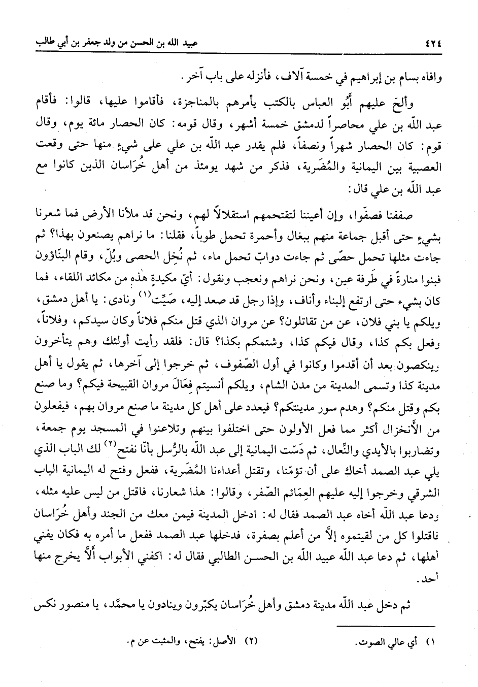 وافاه بسام بن إبراهيم في خمسة آلاف فأنزله على باب آخر وألح عليهم أبو العباس بالكتب يأمرهم بالمناجزة فأقاموا عليها قالوا فأقام عبد الله بن علي محاصر لدمشق خمسة أشهر وقال قومه كان الحصار مائة يوم وقال قوم كان الحصار شهرا ونصفا فلم يقدر عبد الله بن علي على شئ منها حتى وقعت العصبية بين اليمانية والمضرية فذكر من شهد يومئذ من أهل خراسان الذين كانوا مع عبد الله بن علي قال صففنا فصفوا وإن أعيننا لتقتحمهم استقلالا لهم قد ونحن ملأنا الأرض فما شعرنا بشئ حتى أقبل جماعة منهم ببغال وأحمرة تحمل طوبا فقلنا ما نراهم يصنعون بهذا ثم جاءت مثلها تحمل حصى ثم جاءت دواب تحمل ماء ثم نخل الحصى وبل وقام البناؤون فبنوا منارة في طرفة عين ونحن نراهم ونعجب ونقول أي مكيدة هذه من مكائد اللقاء فما كان بشئ حتى ارتفعت إلبناء وأناف وإذا رجل قد صعد إليه صيت (1) ونادى يا أهل دمشق ويلكم يا بني فلان عن من تقاتلون عن مروان الذي قتل منكم فلانا وكان سيدكم وفلانا وفعل بكم كذا وقال فيكم كذا وشتمكم بكذا قال فلقد رأيت أولئك وهم يتأخرون وينكصون بعد أن أقدموا وكانوا في أول الصفوف ثم خرجوا إلى أخرها ثم يقول يا أهل مدينة كذا وتسمى المدينة من مدن الشام ويلكم أنسيتم فعال مروان القبيحة فيكم وما صنع بكم وقتل منكم وهدم سور مدينتكم فيعدد على أهل كل مدينة ما صنع مروان بهم فيفعلون من الأنخزال أكثر مما فعل الأولون حتى اختلفوا بينهم وتلاعنوا في المسجد يوم جمعة وتضاربوا بالأيدي والنعال ثم دست اليمانية إلى عبد الله بالرسل بأنا نفتح (2) لك الباب الذي يلي عبد الصمد أخاك على أن تؤمنا وتقتل أعداءنا المضرية ففعل وفتح له اليمانية الباب الشرقي وخرجوا إليه عليهم العمائم الصفر وقالوا هذا شعارنا فاقتل من ليس عليه مثله ودعا عبد الله أخاه عبد الصمد فقال له ادخل المدينة فيمن معك من الجند وأهل خراسان فاقتلوا كل من لقيتموه إلا من أعلم بصفرة فدخلها عبد الصمد ففعل ما امره به فكان يفني أهلها ثم دعا عبد الله عبيد الله بن الحسن الطالبي فقال له اكفني الأبواب ألا يخرج منها أحد ثم دخل عبد الله مدينة دمشق أهل فراسان يكبرون وينادون يا محمد يا منصور نكس