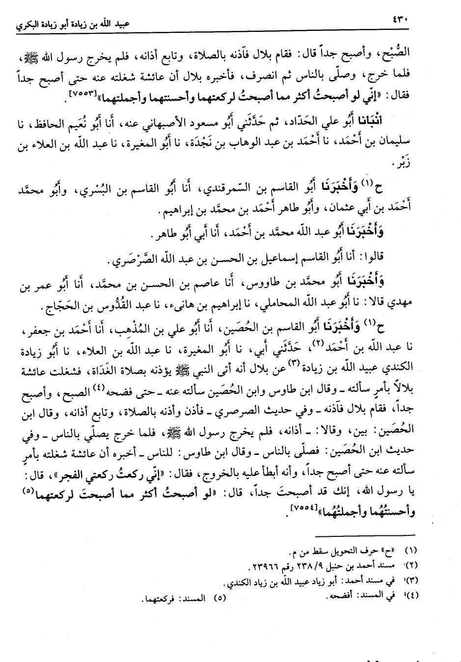 [7553] أنبأنا أبو علي الحداد ثم حدثني أبو مسعود الأصبهاني عنه أنا أبو نعيم الحافظ نا سلمان بن أحمد نا أحمد بن عبد الوهاب بن نجدة نا أبو المغيرة نا عبد الله بن العلاء بن زبر ح (1) وأخبرنا أبو القاسم بن السمرقندي أنا أبو القاسم بن البسرى وأبو محمد أحمد بن أبي عثمان وأبو طاهر بن محمد بن إبراهيم وأخبرنا أبو عبد الله بن أحمد أنا أبي أبو طاهر قالوا أنا أبو القاسم إسماعيل بن الحسن بن عبد الله الصرصري وأخبرنا أبو محمد بن طاووس أنا عاصم بن الحسن بن محمد أنا أبو عمر بن مهدي قالا نا أبو عبد الله المحاملي نا إبراهيم بن هانئ نا عبد القدوس بن الحجاج ح (1) وأخبرنا أبو القاسم بن الحصين أنا أبو علي بن المذهب أنا أحمد بن جعفر نا عبد الله بن أحمد (2) حدثني أبي نا أبو المغيرة نا عبد الله بن العلاء نا أبو زيادة الكندي عبيد الله بن زيادة (3) عن بلال أنه أتى النبي (صلى الله عليه وسلم) يؤذنه بصلاة الغداة فشغلت عائشة بلالا بأمر سألته وقال ابن طاوس وابن الحصين سألته عنه حتى فضحه (4) الصبح واصبح جدا فقال بلال فآذنه وفي حديث الصرصري فاذن وأذنه بالصلاة وتابع أذانه وقال ابن الحصين بين وقالا أذانه فلم يخرج رسول الله (صلى الله عليه وسلم) فلما خرج يصلي بالناس وفي حديث ابن الحصين فصلى بالناس وقال ابن طاوس للناس أخبره أن عائشة شغلته بأمر سألته عنه حتى اصبح جدا وأنه أبطأ عليه بالخروج فقال إني ركعت ركعتي الفجر قال يا رسول الله إنك قد اصبحت جدا قال لو أصبحت أكثر مما أصبحت لركعتهما (5) وأحسنتهما وأجملتهما