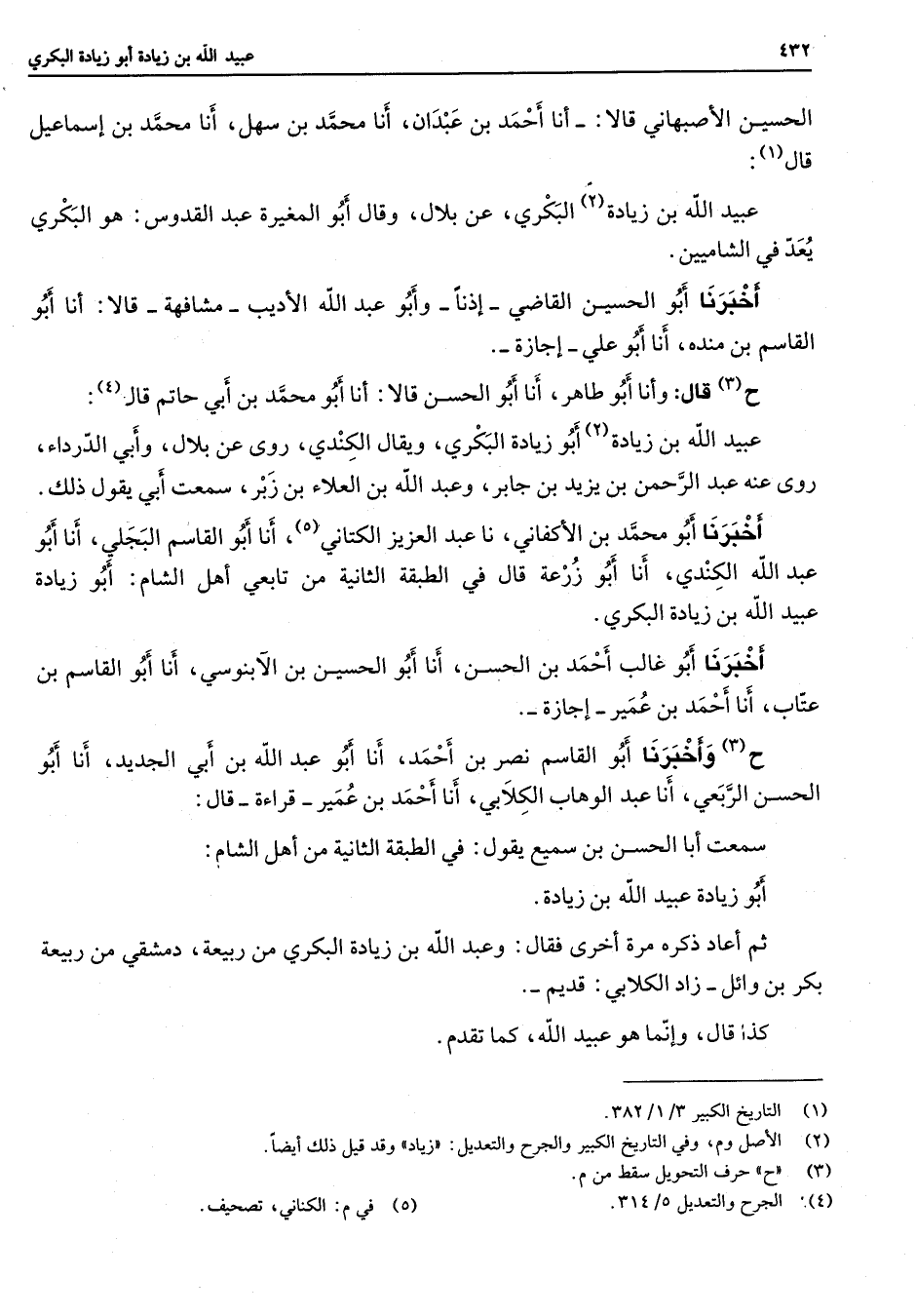 الحسين الأصبهاني قالا أنا أحمد بن عبدان أنا محمد بن سهل أنا محمد بن إسماعيل قال (1) عبيد الله بن زيادة (2) البكري عن بلال وقال أبو المغيرة عبد القدوس هو البكري يعد في الشاميين أخبرنا أبو الحسين القاضي إذنا وابو عبد الله الأديب مشافهة قالا أنا أبو القاسم بن مندة أنا أبو علي إجازة ح (3) قال وأنا أبو طاهر أنا أبو الحسن قالا أنا أبو محمد بن أبي حاتم قال (4) عبيد الله بن زيادة (2) أبو زيادة البكري ويقال الكندي روى عن بلال وأبي الدرداء روى عنه عبد الرحمن بن يزيد بن جابر وعبد الله بن العلاء بن زبر سمعت أبي يقول ذلك أخبرنا أبو محمد بن الأكفاني نا عبد العزيز الكتاني (5) أنا أبو القاسم البجلي أنا أبو عبد الله الكندي أنا أبو زرعة قال في الطبقة الثانية من تابعي أهل الشام أبو زيادة عبيد الله بن زيادة البكري أخبرنا أبو غالب أحمد بن الحسن أنا أبو الحسين بن الآبنوسي أنا أبو القاسم بن عتاب أنا أحمد بن عمير إجازة ح (3) وأخبرنا أبو القاسم نصر بن أحمد أنا أبو عبد الله بن أبي الجديد أنا أبو الحسن الربعي أنا عبد الوهاب الكلابي أنا أحمد بن عمير قراءة قال سمعت أبا الحسن بن سميع يقول في الطبقة الثانية من أهل الشام أبو زيادة عبيد الله بن زيادة ثم اعاد ذكره مرة آخرى فقال وعبد الله بن زيادة البكري من ربيعة دمشقي من ربيعة بكر بن وائل زاد الكلابي قديم كذا قال وإنما هو عبيد الله كما تقدم