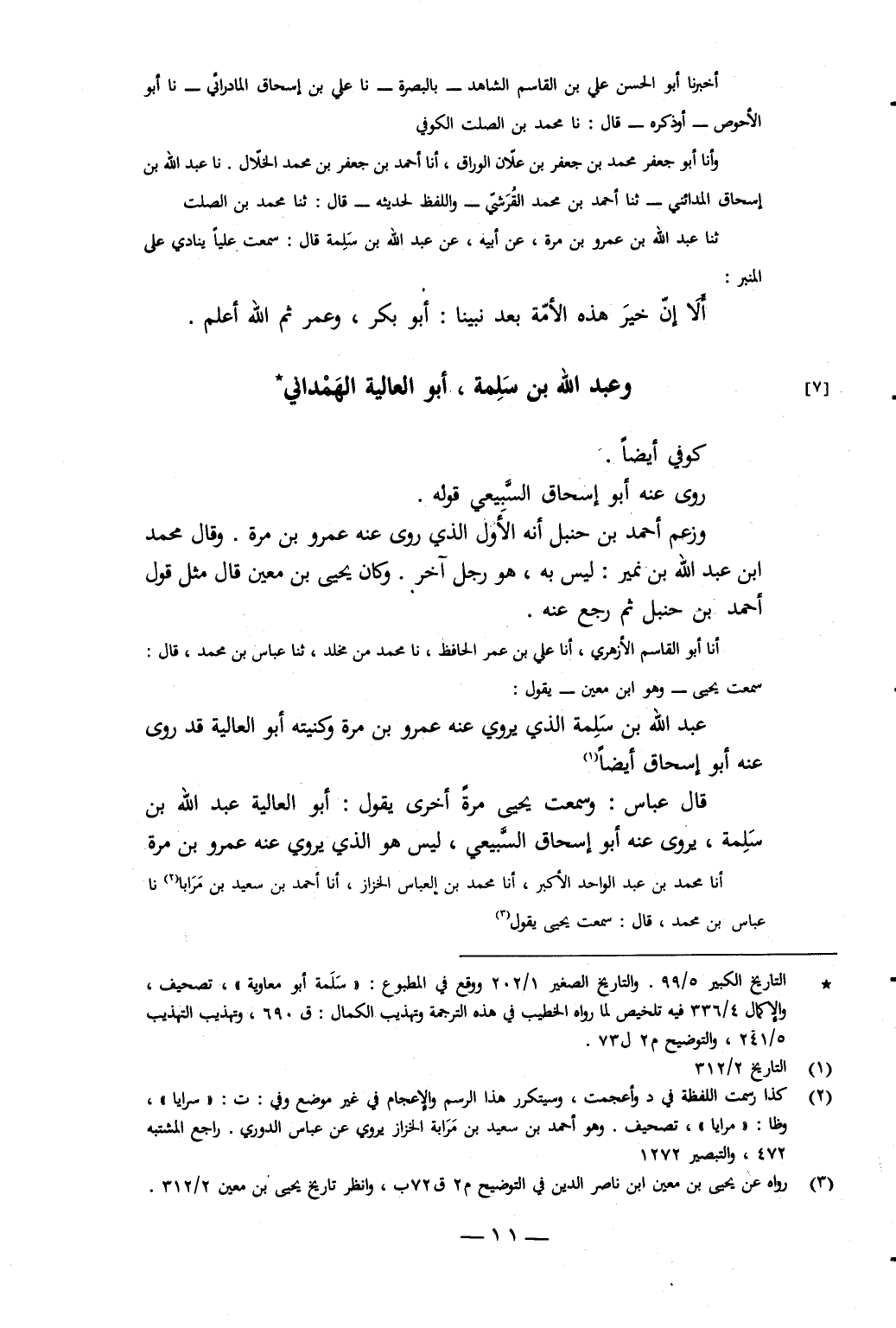 أَنَا أَبُو الْقَاسِمِ الأَزْهَرِيُّ , أَنَا عَلِيُّ بْنُ عُمَرَ الْحَافِظُ , نَا مُحَمَّدُ بْنُ مَخْلَدٍ , ثَنَا عَبَّاسُ بْنُ مُحَمَّدٍ , قَالَ: سَمِعْتُ يَحْيَى، وَهُوَ ابْنَ مَعِينٍ، يَقُولُ: «عَبْدُ اللَّهِ بْنُ سَلِمَةَ الَّذِي يَرْوِي عَنْهُ عَمْرُو بْنُ مُرَّةَ، وَكُنْيَتُهُ أَبُو الْعَالِيَةِ، قَدْ رَوَى عَنْهُ أَبُو إِسْحَاقَ أَيْضًا»