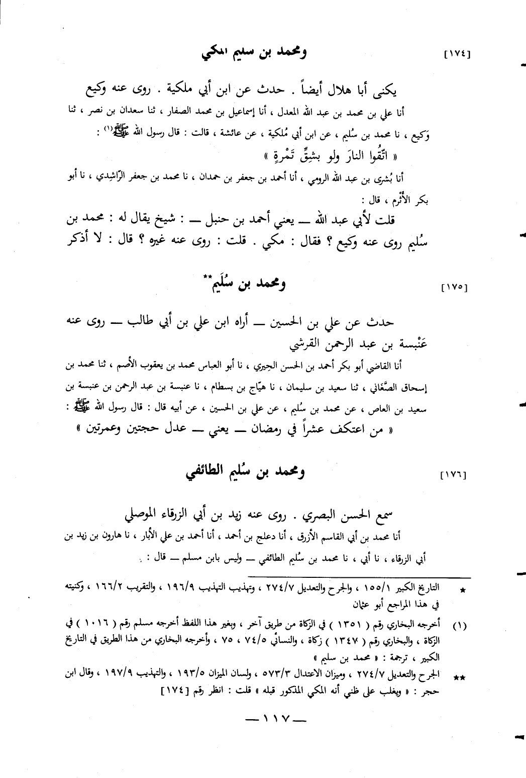 أَنَا بُشْرَى بْنُ عَبْدِ اللَّهِ الرُّومِيُّ، أَنَا أَحْمَدُ بْنُ جَعْفَرِ بْنِ حِمْدَانَ، نَا مُحَمَّدُ بْنُ جَعْفَرٍ الرَّاشِدِيُّ، نَا أَبُو بَكْرٍ الأَثْرَمُ، قَالَ: قُلْتُ لأَبِي عَبْدِ اللَّهِ، يَعْنِي أَحْمَدَ بْنَ حَنْبَلٍ: شَيْخٌ يُقَالُ لَهُ: مُحَمَّدُ بْنُ سُلَيْمٍ رَوَى عَنْهُ وَكِيعٌ؟ فَقَالَ: مَكِّيٌّ، قُلْتُ: رَوَى عَنْهُ غَيْرُهُ؟ قَالَ: لا أَذْكُرُ