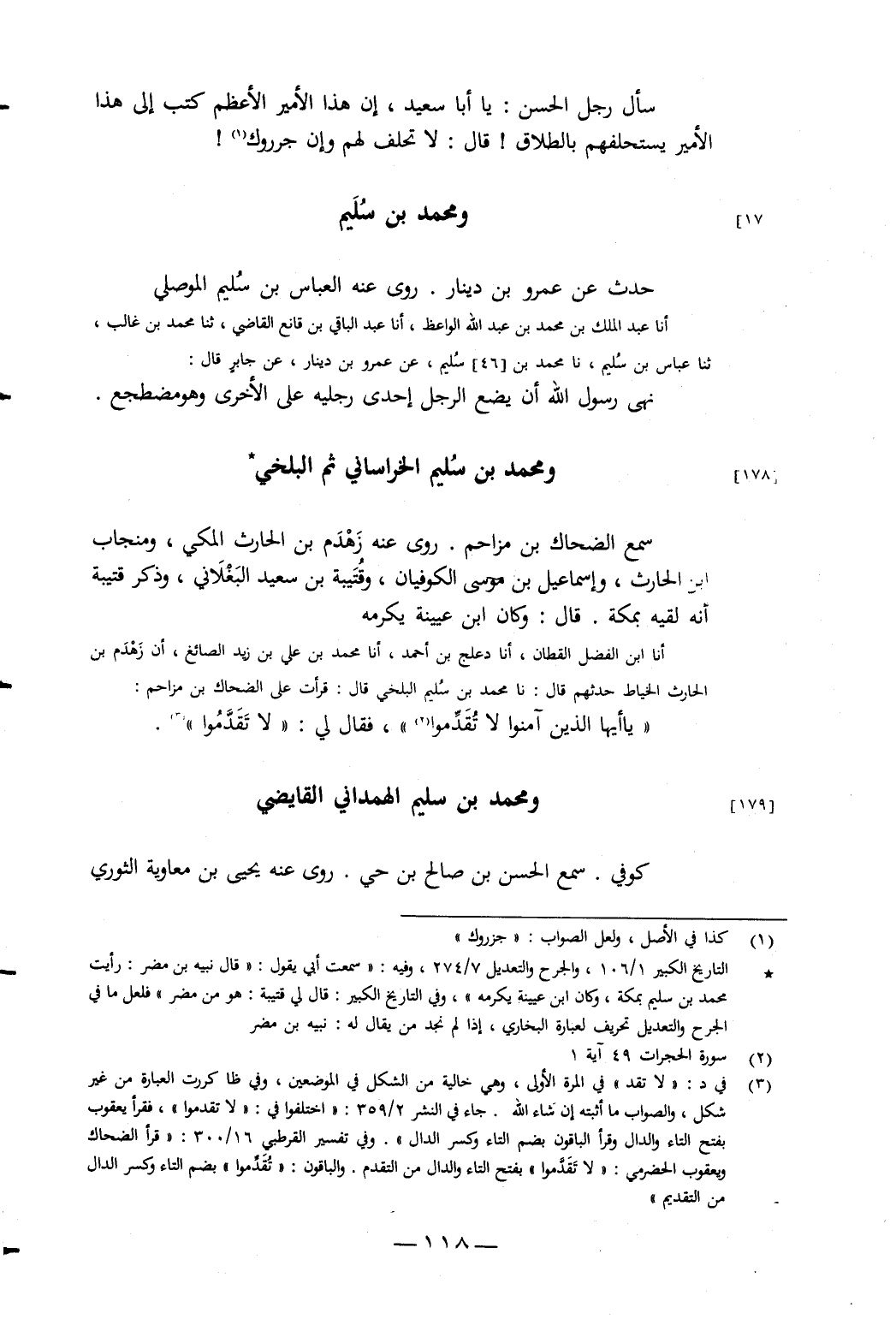 أَنَا ابْنُ الْفَضْلِ الْقَطَّانُ، أَنَا دَعْلَجُ بْنُ أَحْمَدَ، أَنَا مُحَمَّدُ بْنُ عَلِيِّ بْنِ زَيْدٍ الصَّائِغُ، أَنَّ زَهْدَمَ بْنَ الْحَارِثِ الْخَيَّاطُ حَدَّثَهُمْ قَالَ: نَا مُحَمَّدُ بْنُ سُلَيْمٍ الْبَلْخِيُّ قَالَ: قَرَأْتُ عَلَى الضَّحَّاكِ بْنِ مُزَاحِمَ: {يَأَيُّهَا الَّذِينَ آمَنُوا لا تُقَدِّمُوا} [الحجرات: 1]، فَقَالَ لِي: لا تَقَدَّمُوا