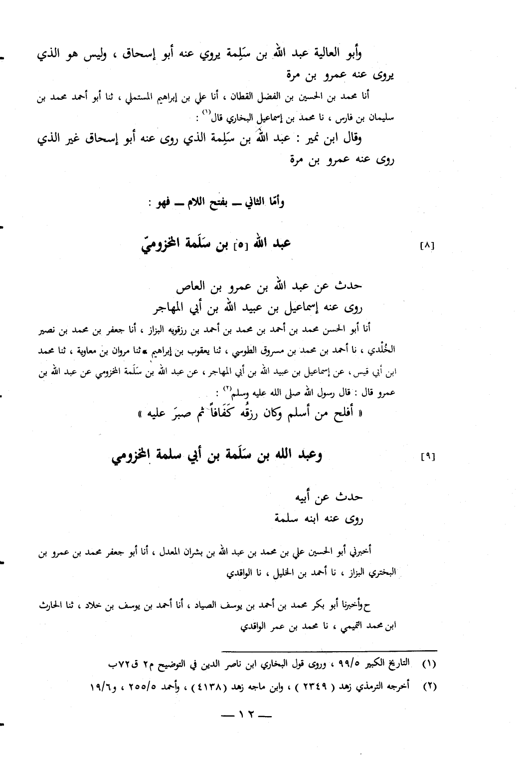 أَنَا مُحَمَّدُ بْنُ الْحُسَيْنِ بْنِ الْفَضْلِ الْقَطَّانُ، أَنَا عَلِيُّ بْنُ إِبْرَاهِيمَ الْمُسْتَمْلِي، ثَنَا أَبُو أَحْمَدَ مُحَمَّدُ بْنُ سُلَيْمَانَ بْنِ فَارِسٍ، نَا مُحَمَّدُ بْنُ إِسْمَاعِيلَ الْبُخَارِيُّ، قَالَ: وَقَالَ ابْنُ نُمَيْرٍ: عَبْدُ اللَّهِ بْنُ سَلِمَةَ الَّذِي رَوَى عَنْهُ أَبُو إِسْحَاقَ، غَيْرُ الَّذِي رَوَى عَنْهُ عَمْرُو بْنُ مُرَّةَ وَأمَّا الثَّانِي بِفَتْحِ اللامِ فَهُوَ:
