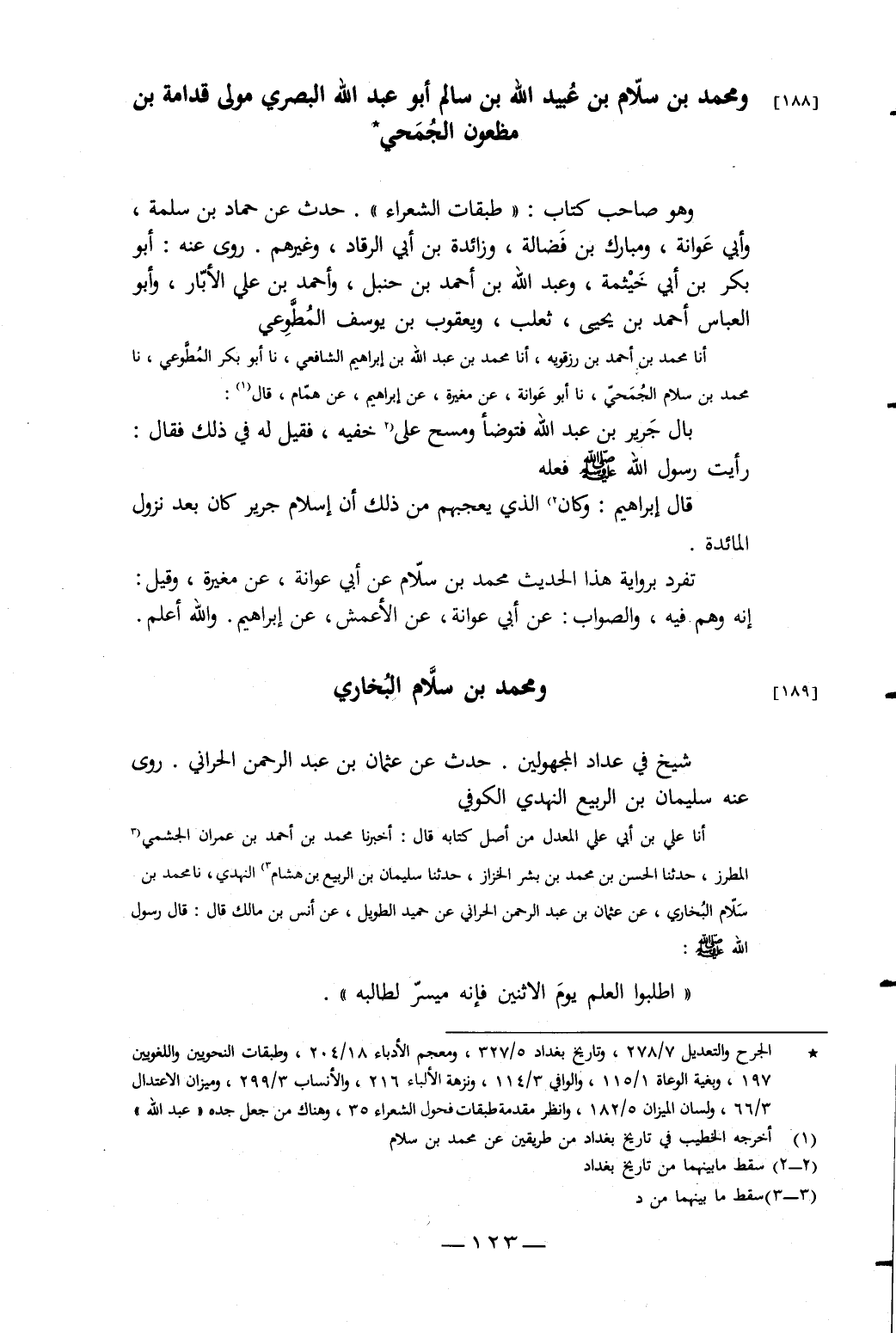 وَمُحَمَّدُ بْنُ سَلامِ بْنِ عُبَيْدِ بْنِ سَالِمٍ أَبُو عَبْدُ اللَّهِ الْبَصْرِيُّ مَوْلَى قُدَامَةَ بْنِ مَظْعُونٍ الْجُمَحِيِّ