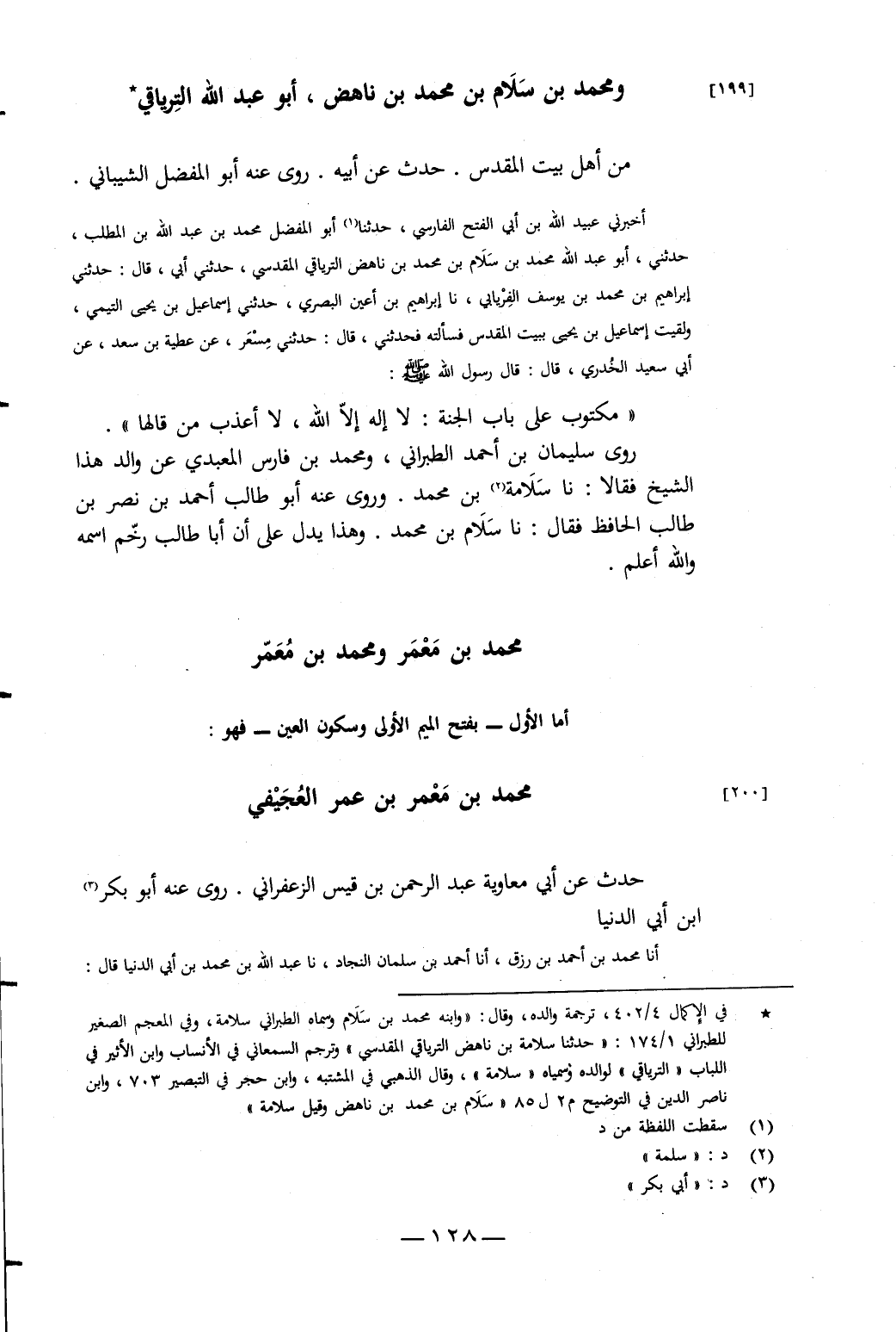 رَوَى سُلَيْمَانُ بْنُ أَحْمَدَ الطَّبَرَانِيُّ، وَمُحَمَّدُ بْنُ فَارِسٍ الْمَعْبَدِيُّ، عَنْ وَالِدِ هَذَا الشَّيْخِ، فَقَالا: نَا سَلامَةُ بْنُ مُحَمَّدٍ، رَوَى عَنْهُ أَبُو طَالِبٍ أَحْمَدُ بْنُ نَصْرِ بْنِ طَالِبٍ الْحَافِظُ، فَقَالَ: نَا سَلامُ بْنُ مُحَمَّدٍ، وَهَذَا يَدُلُّ عَلَى أَنَّ أَبَا طَالِبٍ رَخَّمَ اسْمَهُ وَاللَّهُ أَعْلَمُ