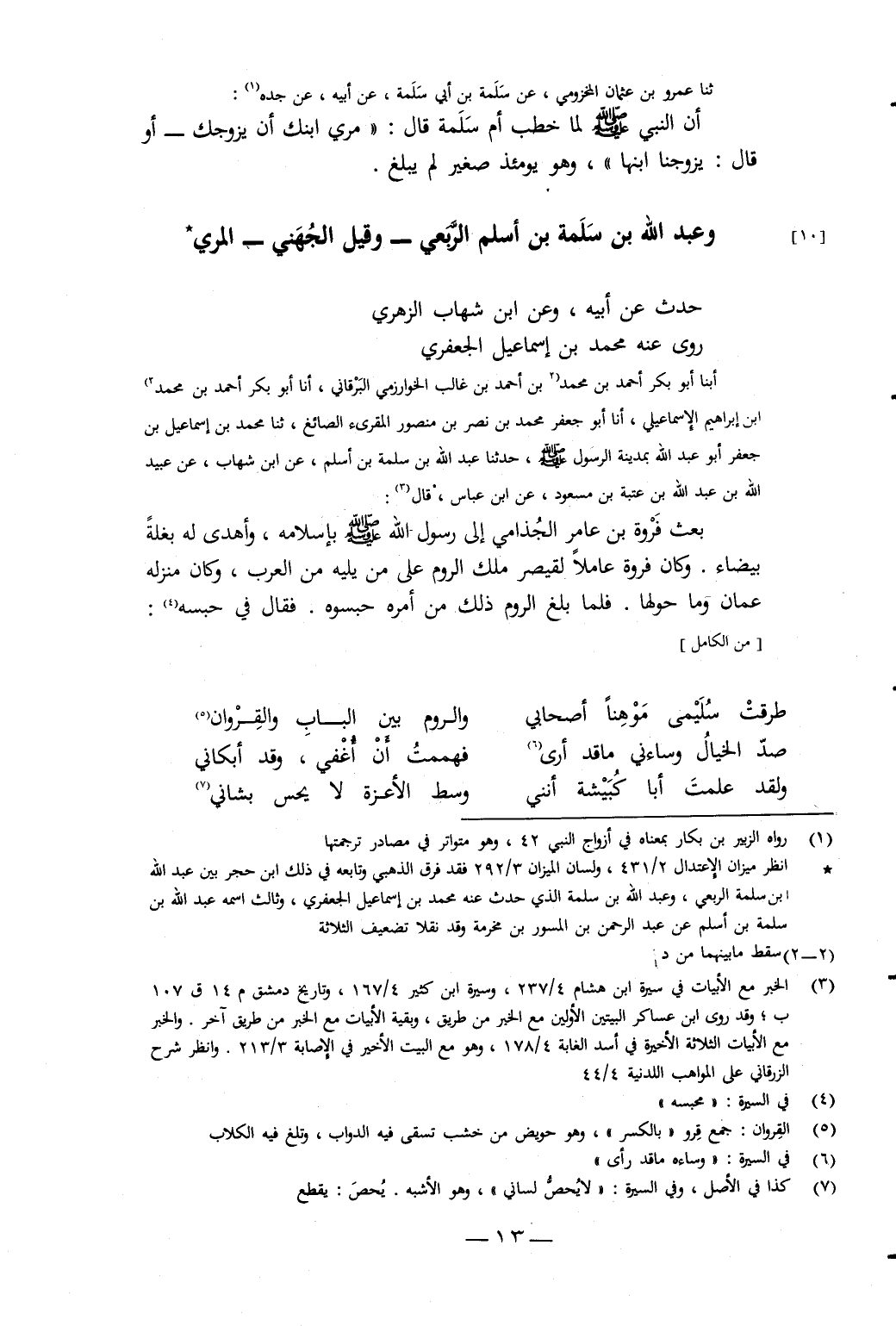 أَنْبَا أَبُو بَكْرٍ أَحْمَدُ بْنُ مُحَمَّدِ بْنِ غَالِبٍ الْخُوَارَزْمِيُّ الْبَرْقَانِيُّ، أَنَا أَبُو بَكْرٍ أَحْمَدُ بْنُ مُحَمَّدِ بْنِ إِبْرَاهِيمَ الإِسْمَاعِيلِيُّ، أَنَا أَبُو جَعْفَرٍ مُحَمَّدُ بْنُ نَصْرِ بْنِ مَنْصُورٍ الْمُقْرِئُ الصَّائِغُ، ثَنَا مُحَمَّدُ بْنُ إِسْمَاعِيلَ بْنِ جَعْفَرٍ أَبُو عَبْدِ اللَّهِ، بِمَدِينَةِ الرَّسُولِ صَلَّى اللَّهُ عَلَيْهِ وَسَلَّمَ، حَدَّثَنَا عَبْدُ اللَّهِ بْنُ سَلَمَةَ بْنِ أَسْلَمَ، عَنِ ابْنِ شِهَابٍ، عَنْ عُبَيْدِ اللَّهِ بْنِ عَبْدِ اللَّهِ بْنِ عُتْبَةَ بْنِ مَسْعُودٍ، عَنِ ابْنِ عَبَّاسٍ، قَالَ: " بَعَثَ فَرْوَةُ بْنُ عَامِرٍ الْجُذَامِيُّ إِلَى رَسُولِ اللَّهِ صَلَّى اللَّهُ عَلَيْهِ وَسَلَّمَ بِإِسْلامِهِ، وَأَهْدَى لَهُ بَغْلَةً بَيْضَاءَ، وَكَانَ فَرْوَةُ عَامِلا لِقَيْصَرَ مَلِكِ الرُّومِ عَلَى مَنْ يَلِيهِ مِنَ الْعَرَبِ، وَكَانَ مَنْزِلُهُ عُمَانُ وَمَا حَوْلَهَا، فَلَمَّا بَلَغَ الرُّومَ ذَلِكَ مِنْ أَمْرِهِ حَبَسُوهُ، فَقَالَ فِي حَبْسِهِ: