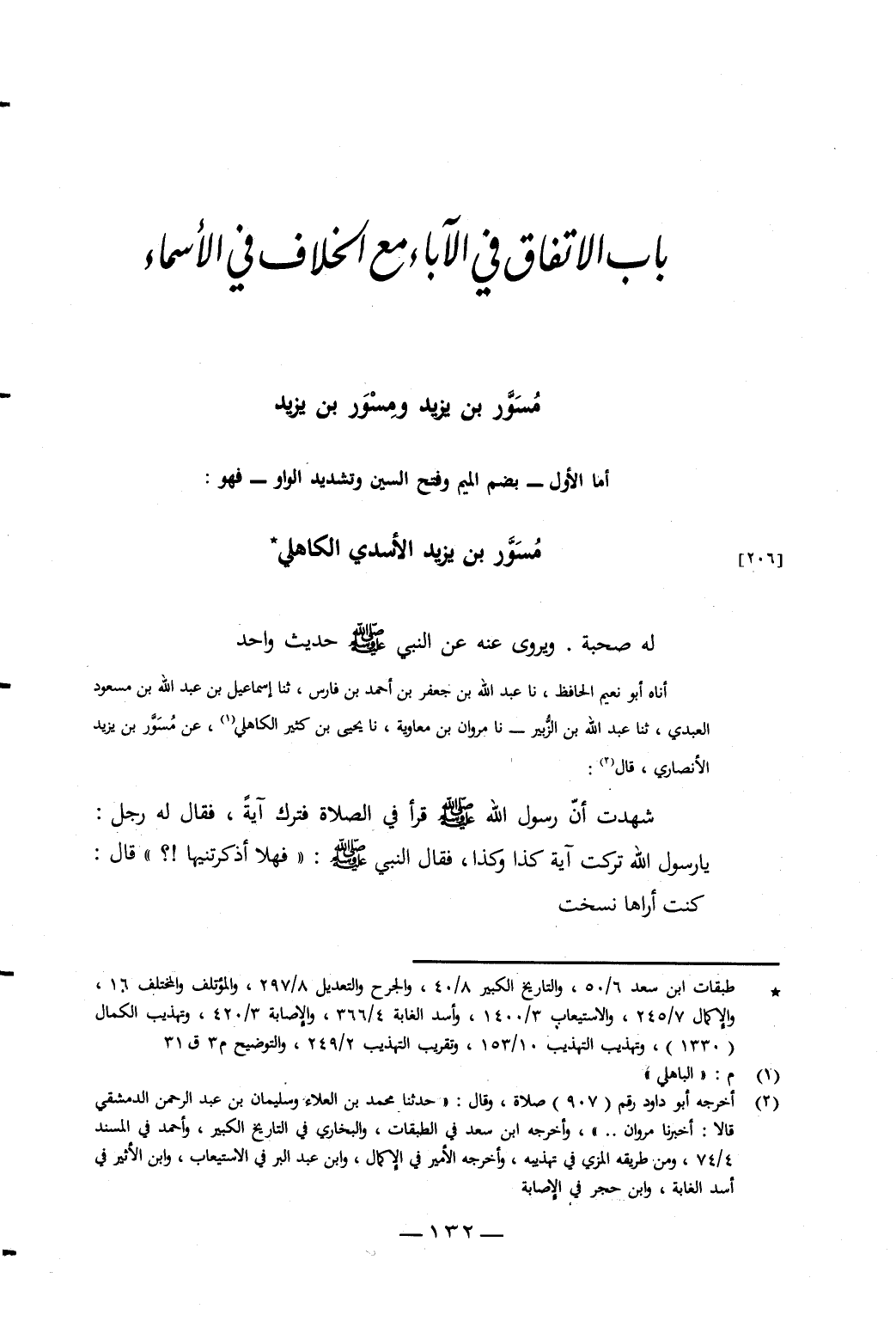 أَنَاهُ أَبُو نُعَيْمٍ الْحَافِظُ، نَا عَبْدُ اللَّهِ بْنُ جَعْفَرِ بْنِ أَحْمَدَ بْنِ فَارِسٍ، ثَنَا إِسْمَاعِيلُ بْنُ عَبْدِ اللَّهِ بْنِ مَسْعُودٍ الْعَبْدِيُّ، ثَنَا عَبْدُ اللَّهِ بْنُ الزُّبَيْرِ، نَا مَرْوَانُ بْنُ مُعَاوِيَةَ، نَا يَحْيَى بْنُ كَثِيرٍ الْكَاهِلِيُّ، عَنْ مُسَوَّرِ بْنِ يَزِيدَ الأَنْصَارِيِّ، قَالَ: شَهِدْتُ أَنَّ رَسُولَ اللَّهِ صَلَّى اللَّهُ عَلَيْهِ وَسَلَّمَ قَرَأَ فِي الصَّلاةِ فَتَرَكَ آيَةً، فَقَالَ لَهُ رَجُلٌ: يَا رَسُولَ اللَّهِ تَرَكْتُ آيَةَ كَذَا وَكَذَا، فَقَالَ النَّبِيُّ صَلَّى اللَّهُ عَلَيْهِ وَسَلَّمَ: «فَهَلا أَذْكَرْتَنِيهَا؟» قَالَ: كُنْتُ أَرَاهَا نُسِخَتْ،