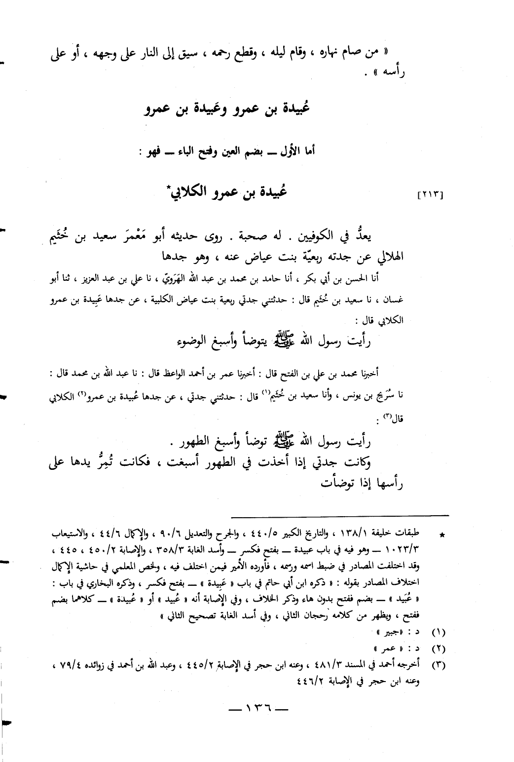 أَخْبَرَنَا مُحَمَّدُ بْنُ عَلِيِّ بْنِ الْفَتْحِ، قَالَ: أَخْبَرَنَا عُمَرُ بْنُ أَحْمَدَ الْوَاعِظُ، قَالَ: نَا عَبْدُ اللَّهِ بْنُ مُحَمَّدٍ، قَالَ: نَا سُرَيْجُ بْنُ يُونُسَ، وَأَنَا سَعِيدُ بْنُ خُثَيْمٍ، قَالَ: حَدَّثَتْنِي جَدَّتِي، عَنْ جَدِّهَا عُبَيْدَةَ بْنِ عَمْرٍو الْكِلابِيِّ، قَالَ: «رَأَيْتُ رَسُولَ اللَّهِ صَلَّى اللَّهُ عَلَيْهِ وَسَلَّمَ تَوَضَّأَ وَأَسْبَغَ الطُّهُورَ»، وَكَانَتْ جَدَّتِي إِذَا أَخَذَتْ فِي الطُّهُورِ أَسْبَغَتْ، فَكَانَتْ تَمُرُّ يَدَهَا عَلَى رَأْسِهَا إِذَا تَوَضَّأَتْ