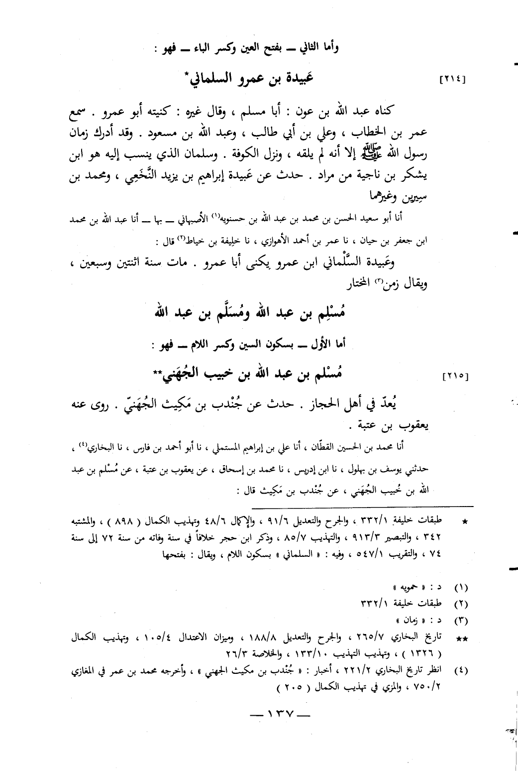 أَنَا عَبْدُ اللَّهِ بْنُ مُحَمَّدِ بْنِ جَعْفَرِ بْنِ حَيَّانَ، نَا عُمَرُ بْنُ أَحْمَدَ الأَهْوَازِيُّ، نَا خَلِيفَةُ بْنُ خَيَّاطٍ، قَالَ: وَعَبِيدَةُ السَّلْمَانِيُّ ابْنُ عَمْرٍو يُكَنَّى أَبَا عَمْرٍو، مَاتَ سَنَةَ اثْنَتَيْنِ وَسَبْعِينَ، وَيُقَالُ: زَمَنُ الْمُخْتَارِ