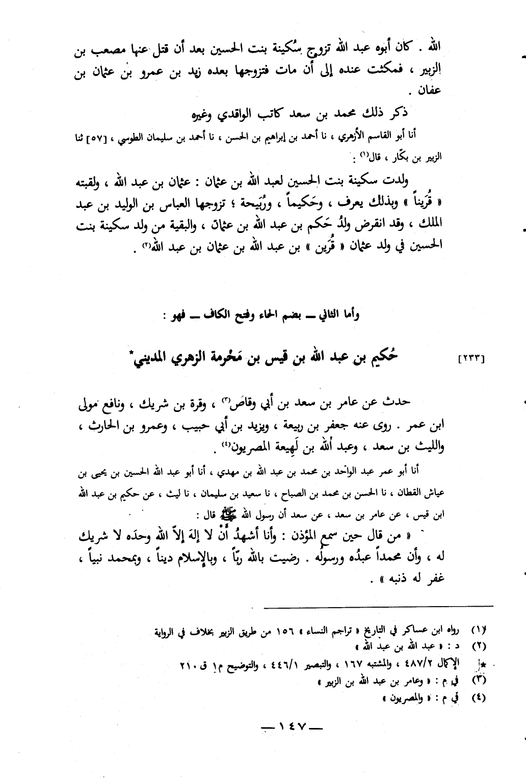 أَنَا أَبُو الْقَاسِمِ الأَزْهَرِيُّ، نَا أَحْمَدُ بْنُ إِبْرَاهِيمَ بْنِ الْحَسَنِ، نَا أَحْمَدُ بْنُ سُلَيْمَانَ الطُّوسِيُّ، ثَنَا الزُّبَيْرُ بْنُ بَكَّارٍ، قَالَ: وَلَدَتْ سُكَيْنَةُ بِنْتُ الْحُسَيْنِ لِعَبْدِ اللَّهِ بْنِ عُثْمَانَ: عُثْمَانَ بْنَ عَبْدِ اللَّهِ، وَلَقَّبَتْهُ قُرَيْنًا وَبِذَلِكَ يُعْرَفُ، وَحَكِيمًا، وَرُبَيْحَةَ تَزَوَّجَهَا الْعَبَّاسُ بْنُ الْوَلِيدِ بْنِ عَبْدِ الْمَلِكِ، وَقَدِ انْقَرَضَ وَلَدُ حَكِيمِ بْنِ عَبْدِ اللَّهِ بْنِ عُثْمَانَ، وَالْبَقِيَّةُ مِنْ وَلَدِ سُكَيْنَةَ بِنْتِ الْحُسَيْنِ فِي وَلَدِ عُثْمَانَ قُرَيْنِ بْنِ عَبْدِ اللَّهِ بْنِ عُثْمَانَ بْنِ عَبْدِ اللَّهِ وَأَمَّا الثَّانِي بِضَمِّ الْحَاءِ وَفَتْحِ الْكَافِ فَهُوَ: