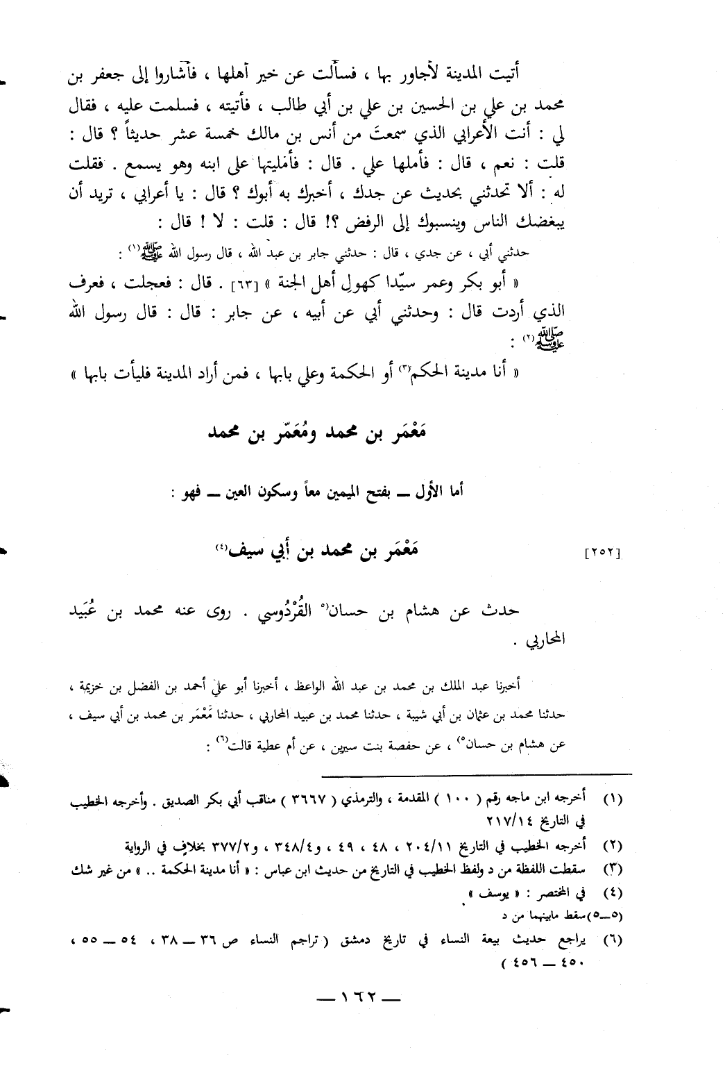 أَتَيْتُ الْمَدِينَةَ لأَجَاوِرَ بِهَا، فَسَأَلْتُ عَنْ خَيْرِ أَهْلِهَا، فَأَشَارُوا إِلَى جَعْفَرِ بْنِ مُحَمَّدِ بْنِ عَلِيِّ بْنِ الْحُسَيْنِ بْنِ عَلِيِّ بْنِ أَبِي طَالِبٍ، فَأَتَيْتُهُ، فَسَلَّمْتُ عَلَيْهِ، فَقَالَ لِي: أَنْتَ الأَعْرَابِيُّ الَّذِي سَمِعْتَ مِنْ أَنَسِ بْنِ مَالِكٍ خَمْسَةَ عَشْرَ حَدِيثًا؟ قَالَ: قُلْتُ: نَعَمْ، قَالَ: فَأَمْلِهَا عَلَيَّ، قَالَ: فَأَمْلَيْتُهَا عَلَى ابْنِهِ، وَهُوَ يَسْمَعُ، فَقُلْتُ لَهُ: أَلا تُحَدِّثْنِي بِحَدِيثٍ عَنْ جَدِّكَ، أَخْبَرَكَ بِهِ أَبُوكَ؟ قَالَ: يَا أَعْرَابِيُّ، تُرِيدُ أَنْ وَيَنْسِبُوكَ إِلَى الرَّفْضِ؟! يُبَغِّضُكَ النَّاسَ، قَالَ: قُلْتُ لا، قَالَ: حَدَّثَنِي أَبِي، عَنْ جَدِّي، قَالَ: حَدَّثَنِي جَابِرُ بْنُ عَبْدِ اللَّهِ، قَالَ رَسُولُ اللَّهِ صَلَّى اللَّهُ عَلَيْهِ وَسَلَّمَ: «أَبُو بَكْرٍ وَعُمَرُ سَيِّدَا كُهُولِ أَهْلِ الْجَنَّةِ»، قَالَ: فَعَجِلْتُ، فَعَرَفَ الَّذِي أَرَدْتُ