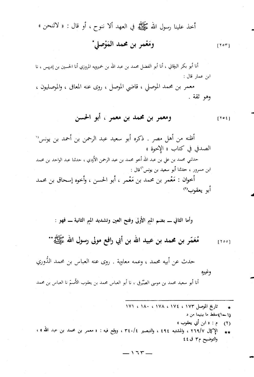 حَدَّثَنِي مُحَمَّدُ بْنُ عَلِيِّ بْنِ عَبْدِ اللَّهِ، أَخُو مُحَمَّدِ بْنِ عَبْدِ الرَّحْمَنِ الأَزْدِيُّ، حَدَّثَنَا عَبْدُ الْوَاحِدِ بْنُ مُحَمَّدِ بْنِ مَسْرُورٍ، حَدَّثَنَا أَبُو سَعِيدِ بْنِ يُونُسَ، قَالَ: أُخْوَانُ مَعْمَرِ بْنِ مُحَمَّدِ بْنِ مَعْمَرٍ، أَبُو الْحَسَنِ، وَأَخُوهُ إِسْحَاقُ بْنُ مُحَمَّدِ أَبُو يَعْقُوبَ وَأَمَّا الثَّانِي بِضَمِّ الْمِيمِ الأُولَى وَفَتْحِ الْعَيْنِ وَتَشْدِيدِ الْمِيمِ الثَّانِيَّةِ فَهُوَ: