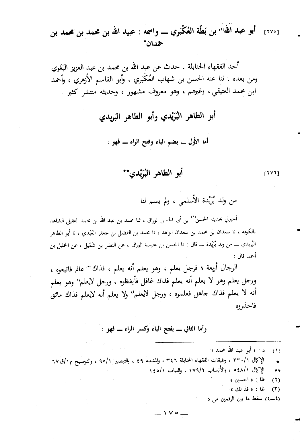 أَخْبَرَنِي بِحَدِيثِهِ الْحَسَنُ بْنُ أَبِي الْحَسَنِ الْوَرَّاقُ، ثَنَا مُحَمَّدُ بْنُ عَبْدِ اللَّهِ بْنِ مُحَمَّدٍ الْعَقِيلِيُّ الشَّاهِدُ، بِالْكُوفَةِ، نَا سَعْدَانُ بْنُ مُحَمَّدِ بْنِ سَعْدَانَ الزَّاهِدُ، نَا مُحَمَّدُ بْنُ الْفَضْلِ بْنِ جَعْفَرٍ الْعَبْدِيُّ، نَا أَبُو الطَّاهِرِ الْبُرَيْدِيُّ، مِنْ وَلَدِ بُرَيْدَةَ، قَالَ: نَا الْحَسَنُ بْنُ عَنْبَسَةَ الْوَرَّاقُ، عَنِ النَّضْرِ بْنِ شُمَيْلٍ، عَنِ الْخَلِيلِ بْنِ أَحْمَدَ، قَالَ: الرِّجَالُ أَرْبَعَةٌ، فَرَجُلٌ يَعْلَمُ، وَهُوَ يَعْلَمُ أَنَّهُ يَعْلَمُ، فَذَاكَ عَالِمٌ فَاتْبَعُوهُ، وَرَجُلٌ يَعْلَمُ وَهُوَ لا يَعْلَمُ أَنَّهُ يَعْلَمُ فَذَاكَ غَافِلٌ فَأَيْقِظُوهُ، وَرَجُلٌ لا يَعْلَمُ وَهُوَ يَعْلَمُ أَنَّهُ لا يَعْلَمُ فَذَاكَ جَاهِلٌ فَعَلِّمُوهُ، وَرَجُلٌ لا يَعْلَمُ وَلا يَعْلَمُ أَنَّهُ لا يَعْلَمُ فَذَاكَ مَائِقٌ فَاحْذَرُوهُ وَأَمَّا الثَّانِي بِفَتْحِ الْبَاءِ وَكَسْرِ الرَّاءِ فَهُوَ: