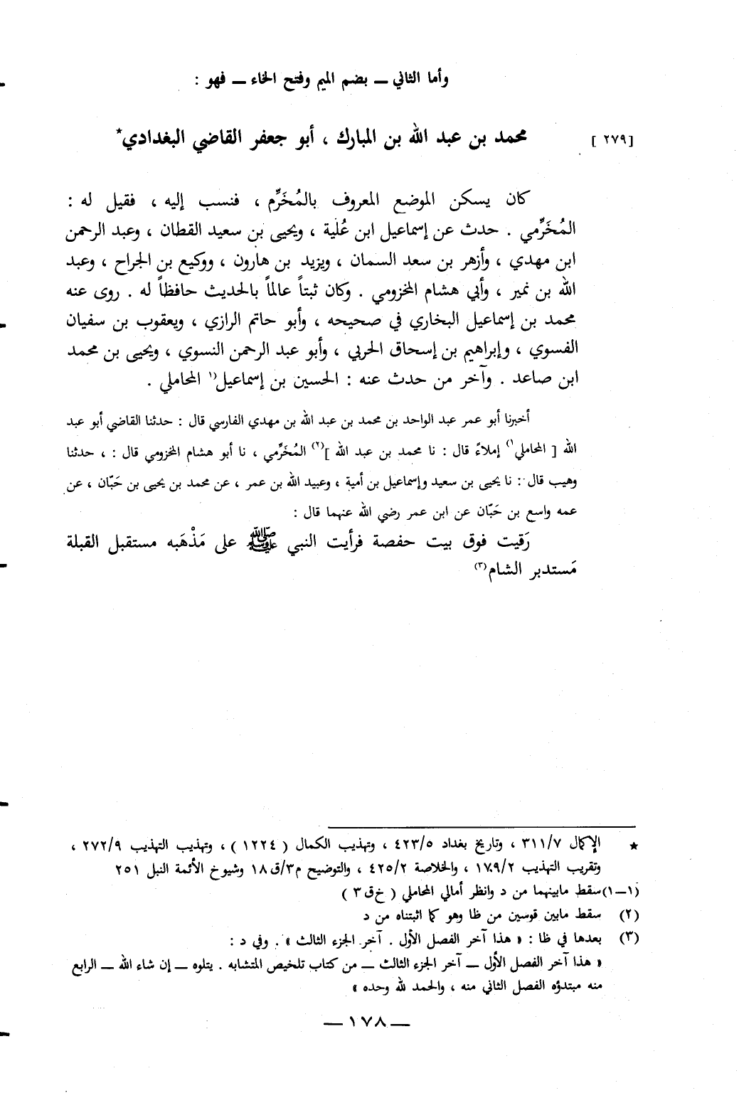 أَخْبَرَنَا أَبُو عُمَرَ عَبْدُ الْوَاحِدِ بْنُ مُحَمَّدِ بْنِ عَبْدِ اللَّهِ بْنِ مَهْدِيٍّ الْفَارِسِيُّ، قَالَ: حَدَّثَنَا الْقَاضِي أَبُو عَبْدِ اللَّهِ الْمَحَامِلِيُّ، إِمْلاءً، قَالَ: نَا مُحَمَّدُ بْنُ عَبْدِ اللَّهِ الْمَخْرَمِيُّ، نَا أَبُو هِشَامٍ الْمَخْزُومِيُّ، قَالَ: حَدَّثَنَا وُهَيْبٌ، قَالَ: نَا يَحْيَى بْنُ سَعِيدٍ، وَإِسْمَاعِيلُ بْنُ أُمَيَّةَ، وَعُبَيْدُ اللَّهِ بْنُ عُمَرَ، عَنْ مُحَمَّدِ بْنِ يَحْيَى بْنِ حَبَّانَ، عَنْ عَمِّهِ وَاسِعِ بْنِ حَبَّانَ، عَنِ ابْنِ عُمَرَ، رَضِيَ اللَّهُ عَنْهُمَا، قَالَ: «رَقِيتُ فَوْقَ بَيْتِ حَفْصَةَ فَرَأَيْتُ النَّبِيَّ صَلَّى اللَّهُ عَلَيْهِ وَسَلَّمَ عَلَى مَذْهَبِهِ مُسْتَقْبِلَ الْقِبْلَةِ مُسْتَدْبِرَ الشَّامِ»