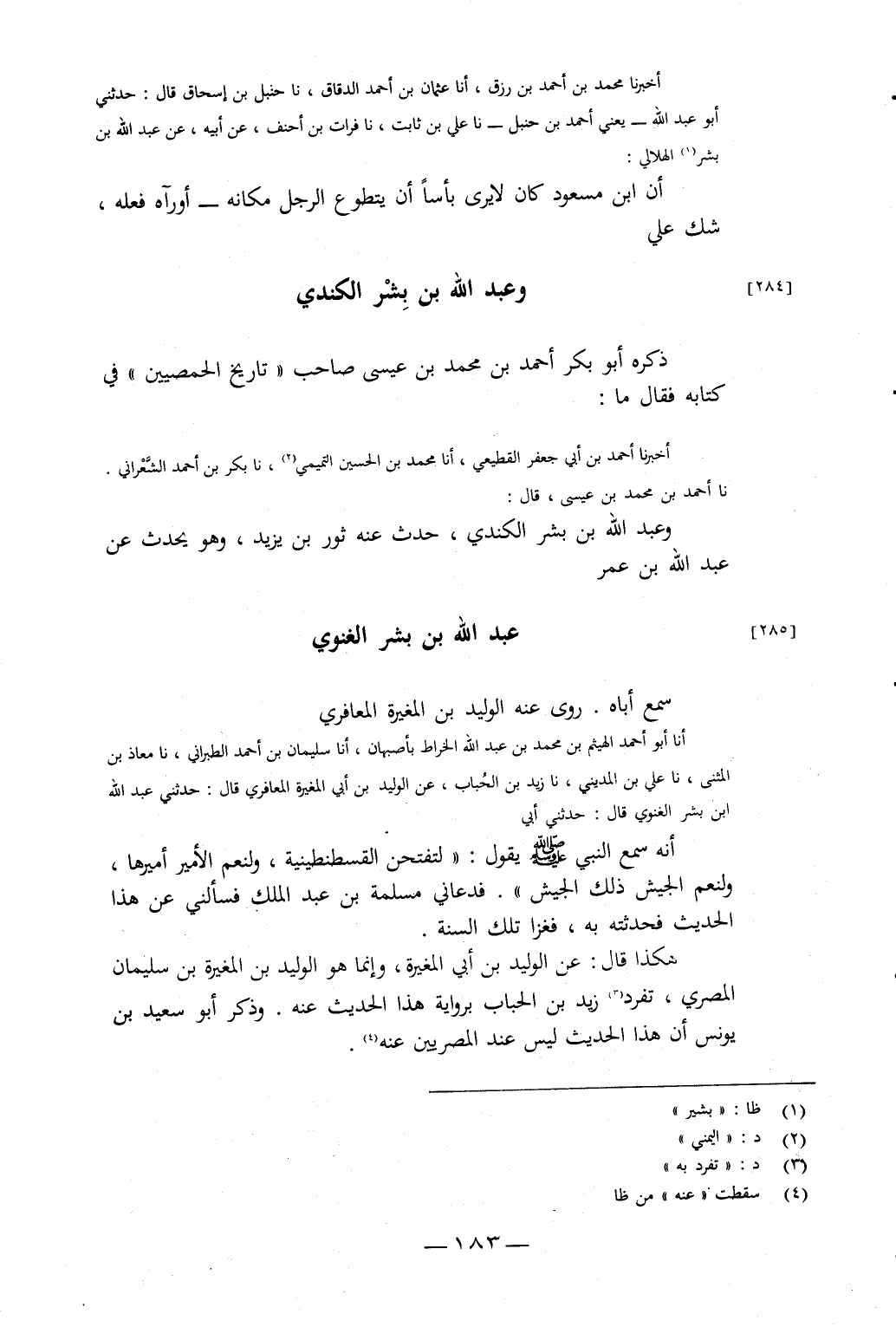 أَنَا أَبُو أَحْمَدَ الْهَيْثَمُ بْنُ مُحَمَّدِ بْنِ عَبْدِ اللَّهِ الْخَرَّاطُ، بِأَصْبَهَانَ، أَنَا سُلَيْمَانُ بْنُ أَحْمَدَ الطَّبَرَانِيُّ، نَا مُعَاذُ بْنُ الْمُثَنَّى، نَا عَلِيُّ بْنُ الْمَدِينِيُّ، نَا زَيْدُ بْنُ الْحُبَابِ، عَنِ الْوَلِيدِ بْنِ أَبِي الْمُغِيرَةِ الْمَعَافِرِيِّ، قَالَ: حَدَّثَنِي عَبْدُ اللَّهِ بْنُ بِشْرٍ الْغَنَوِيُّ، قَالَ: حَدَّثَنِي أَبِي أَنَّهُ، سَمِعَ النَّبِيَّ صَلَّى اللَّهُ عَلَيْهِ وَسَلَّمَ يَقُولُ: «لَتُفْتَحَنَّ الْقَسْطَنْطِينِيَّةُ، وَلَنِعْمَ الأَمِيرُ أَمِيرُهَا، وَلَنِعْمَ الْجَيْشُ ذَلِكَ الْجَيْشُ»، فَدَعَانِي مَسْلَمَةُ بْنُ عَبْدِ الْمَلِكِ فَسَأَلَنِي عَنْ هَذَا الْحَدِيثِ، فَحَدَّثْتُهُ بِهِ، فَغَزَا تِلْكَ السَّنَةِ، هَكَذَا قَالَ: عَنِ الْوَلِيدِ بْنِ أَبِي الْمُغِيرَةِ، وَإِنَّمَا هُوَ الْوَلِيدُ بْنُ الْمُغِيرَةَ بْنِ سُلَيْمَانَ الْمِصْرِيُّ، تَفَرَّدَ زَيْدُ بْنُ الْحُبَابِ بِرِوَايَةِ هَذَا الْحَدِيثِ عَنْهُ، وَذَكَرَ أَبُو سَعِيدِ بْنُ يُونُسَ أَنَّ هَذَا الْحَدِيثَ لَيْسَ عِنْدَ الْمِصْرِيِّينَ عَنْهُ