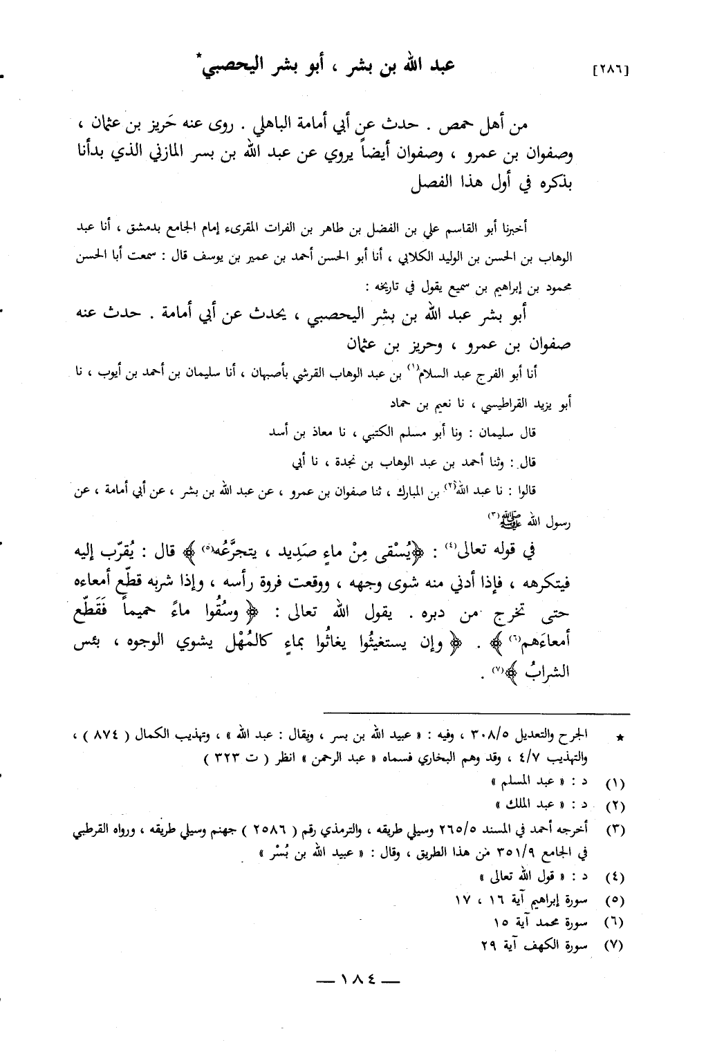 أَنَا أَبُو الْفَرَجِ عَبْدُ السَّلامِ بْنُ عَبْدِ الْوَهَّابِ الْقُرَشِيُّ، بِأَصْبَهَانَ، أَنَا سُلَيْمَانُ بْنُ أَحْمَدَ بْنِ أَيُّوبَ، نَا أَبُو يَزِيدَ الْقَرَاطِيسِيُّ، نَا نُعَيْمُ بْنُ حَمَّادٍ، قَالَ سُلَيْمَانُ: وَنَا أَبُو مُسْلِمٍ الْكَشِّيُّ، نَا مُعَاذُ بْنُ أَسَدٍ، قَالَ: وَثَنَا أَحْمَدُ بْنُ عَبْدِ الْوَهَّابِ بْنِ نَجْدَةَ، نَا أَبِي، قَالُوا: نَا عَبْدُ اللَّهِ بْنُ الْمُبَارَكِ، ثَنَا صَفْوَانُ بْنُ عَمْرٍو، عَنْ عَبْدِ اللَّهِ بْنِ بِشْرٍ، عَنْ أَبِي أُمَامَةَ، عَنْ رَسُولِ اللَّهِ صَلَّى اللَّهُ عَلَيْهِ وَسَلَّمَ: فِي قَوْلِهِ تَعَالَى: {وَيُسْقَى مِنْ مَاءٍ صَدِيدٍ {16} يَتَجَرَّعُهُ} [إبراهيم: 16 - 17]، قَالَ: " يُقَرَّبُ إِلَيْهِ فَيَتْرُكُهُ، فَإِذَا أُدْنِيَ مِنْهُ شَوَى وَجْهَهُ، وَوَقَعَتْ فَرْوَةُ رَأْسِهِ، وَإِذَا شَرِبَهُ قَطَّعَ أَمْعَاءَهُ حَتَّى تَخْرُجَ مِنْ دُبُرِهِ، يَقُولُ اللَّهُ تَعَالَى: {وَسُقُوا مَاءً حَمِيمًا فَقَطَّعَ أَمْعَاءَهُمْ} [محمد: 15]، {وَإِنْ يَسْتَغِيثُوا يُغَاثُوا بِمَاءٍ كَالْمُهْلِ يَشْوِي الْوُجُوهَ بِئْسَ الشَّرَابُ} [الكهف: 29] "،