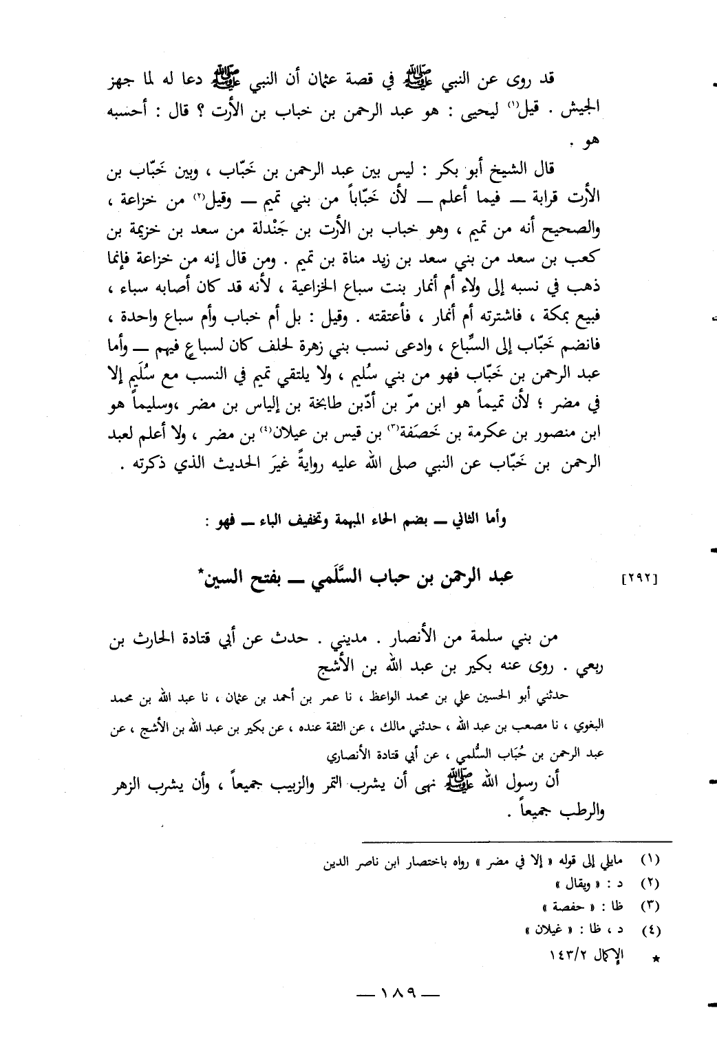 قَدْ رَوَى عَنِ النَّبِيِّ صَلَّى اللَّهُ عَلَيْهِ وَسَلَّمَ فِي قِصَّةِ عُثْمَانَ: أَنَّ النَّبِيَّ صَلَّى اللَّهُ عَلَيْهِ وَسَلَّمَ «دَعَا لَهُ لَمَّا جَهَّزَ الْجَيْشَ»، قِيلَ لِيَحْيَى: هُوَ عَبْدُ الرَّحْمَنِ بْنُ خَبَّابِ بْنِ الأَرَتِّ؟ قَالَ: أَحْسَبُهُ هُوَ، قَالَ الشَّيْخُ أَبُو بَكْرٍ: لَيْسَ بَيْنَ عَبْدِ الرَّحْمَنِ بْنِ خَبَّابٍ، وَبَيْنَ خَبَّابِ بْنِ الأَرَتِّ قَرَابَةٌ فِيمَا أَعْلَمُ لأَنَّ خَبَّابًا مِنْ بَنِي تَمِيمٍ، وَقِيلَ مِنْ خُزَاعَةَ، وَالصَّحِيحُ أَنَّهُ مِنْ تَمِيمٍ، وَهُوَ خَبَّابُ بْنُ الأَرَتِّ بْنِ جَنْدَلَةَ مِنْ سَعْدِ بْنِ خُزَيْمَةَ بْنِ كَعْبِ بْنِ سَعْدٍ مِنْ بَنِي سَعْدِ بْنِ زَيْدِ مَنَاةَ بْنِ تَمِيمٍ، وَمَنْ قَالَ: إِنَّهُ مِنْ خُزَاعَةَ فَإِنَّمَا ذَهَبَ فِي نَسَبِهِ إِلَى وَلاءَ أُمِّ أَنْمَارِ بِنْتِ سِبَاعٍ الْخُزَاعِيَّةِ، لأَنَّهُ قَدْ كَانَ أَصَابَهُ سِبَاءً، فَبِيعَ بِمَكَّةَ، فَاشْتَرَتْهُ أُمُّ أَنْمَارٍ، فَأَعْتَقَتْهُ، وَقِيلَ: بِلْ أُمُّ خَبَّابٍ وَأُمُّ سِبَاعٍ وَاحِدَةٌ، فَانْضَمَّ خَبَّابُ إِلَى السِّبَاعِ، وَادَّعَى نَسَبَ بَنِي زَهْرَةَ لِحِلْفٍ كَانَ لِسِبَاعٍ فِيهِمْ، وَأَمَّا عَبْدُ الرَّحْمَنِ بْنُ خَبَّابٍ فَهُوَ مِنْ بَنِي سُلَيْمٍ، وَلا يَلْتَقِي تَمِيمُ فِي النَّسَبِ مَعَ سُلَيْمٍ إِلا فِي مُضَرَ، لأَنَّ تَمِيمًا هُوَ ابْنُ مُرِّ بْنِ أَدِّ بْنِ طَابِخَةَ بْنِ إِلْيَاسَ بْنِ مُضَرَ،
