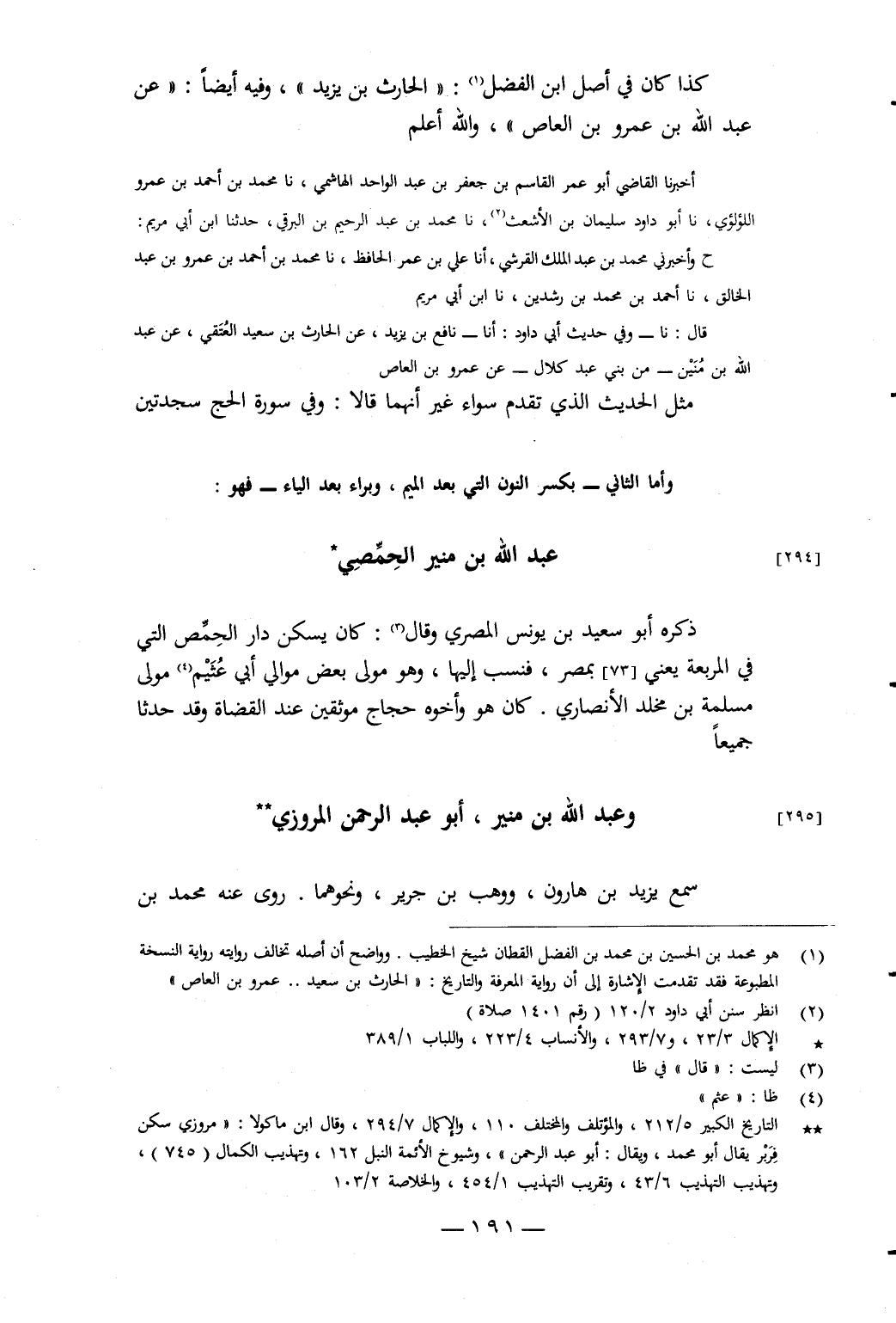 كَذَا كَانَ فِي أَصْلِ ابْنِ الْفَضْلِ: الْحَارِثُ بْنُ يَزِيدَ، وَفِيهِ أَيْضًا عَنْ عَبْدِ اللَّهِ بْنِ عَمْرِو بْنِ الْعَاصِ، وَاللَّهُ أَعْلَمُ، أَخْبَرَنَا الْقَاضِي أَبُو عُمَرَ الْقَاسِمُ بْنُ جَعْفَرِ بْنِ عَبْدِ الْوَاحِدِ الْهَاشِمِيُّ، نَا مُحَمَّدُ بْنُ أَحْمَدَ بْنِ عَمْرٍو اللُّؤْلُؤِيُّ، نَا أَبُو دَاوُدَ سُلَيْمَانُ بْنُ الأَشْعَثِ، نَا مُحَمَّدُ بْنُ عَبْدِ الرَّحِيمِ بْنِ الْبَرْقِيِّ، حَدَّثَنَا ابْنُ أَبِي مَرْيَمَ، ح وَأَخْبَرَنِي مُحَمَّدُ بْنُ عَبْدِ الْمَلِكِ الْقُرَشِيُّ، أَنَا عَلِيُّ بْنُ عُمَرَ الْحَافِظُ، نَا مُحَمَّدُ بْنُ أَحْمَدَ بْنِ عَمْرِو بْنِ عَبْدِ الْخَالِقِ، نَا أَحْمَدُ بْنُ مُحَمَّدِ بْنِ رِشْدِينَ، نَا ابْنُ