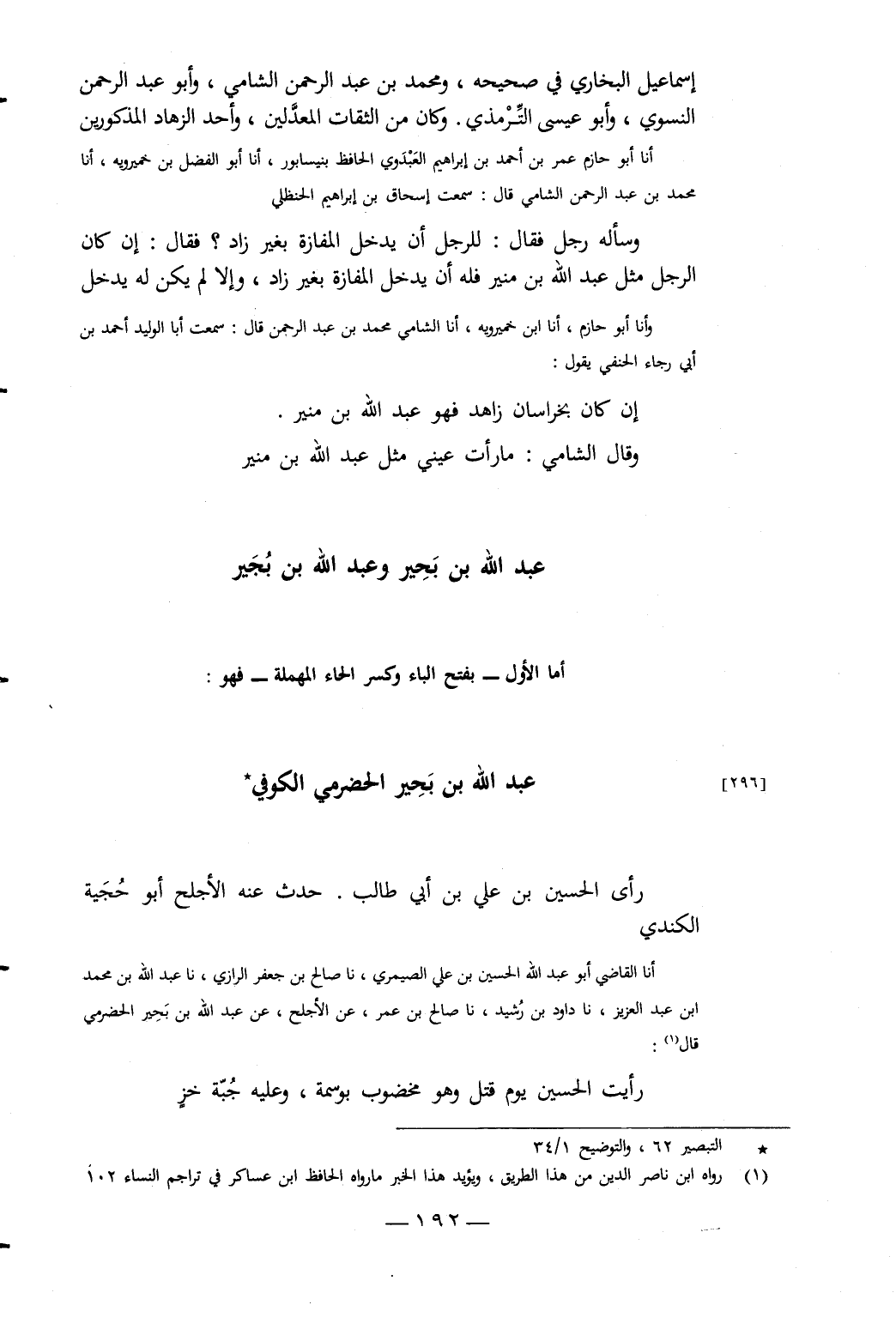 أَنَا الْقَاضِي أَبُو عَبْدِ اللَّهِ الْحُسَيْنُ بْنُ عَلِيٍّ الصَّيْمَرِيُّ، نَا صَالِحُ بْنُ جَعْفَرٍ الرَّازِيُّ، نَا عَبْدُ اللَّهِ بْنُ مُحَمَّدِ بْنِ عَبْدِ الْعَزِيزِ، نَا دَاوُدُ بْنُ رُشَيْدٍ، نَا صَالِحُ بْنُ عُمَرَ، عَنِ الأَجْلَحِ، عَنْ عَبْدِ اللَّهِ بْنِ بَحِيرٍ الْحَضْرَمِيُّ، قَالَ: رَأَيْتُ الْحُسَيْنَ يَوْمَ قُتِلَ وَهُوَ مَخْضُوبٌ بِوَسْمَةٍ، وَعَلْيِهِ جُبَّةُ خَزٍّ