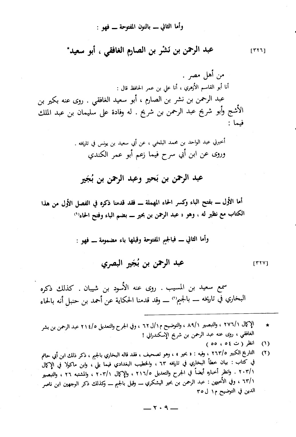أَمَّا الأَوَّلُ بِفَتْحِ الْبَاءِ وَكَسْرِ الْحَاءِ الْمُهْمَلَةِ فَقَدْ قَدَّمْنَا ذِكْرَهُ فِي الْفَصْلِ الأَوَّلِ مِنْ هَذَا الْكِتَابِ مَعَ نَظِيرٍ لَهُ، وَهُوَ عَبْدُ الرَّحْمَنِ بْنُ بُجَيْرٍ بِضَمِّ الْبَاءِ وَفَتْحِ الْحَاءِ وَأَمَّا الثَّانِي فَبِالْجِيمِ الْمَفْتُوحَةِ وَقَبْلَهَا بَاءٌ مَضْمُومَةٌ فَهُوَ: