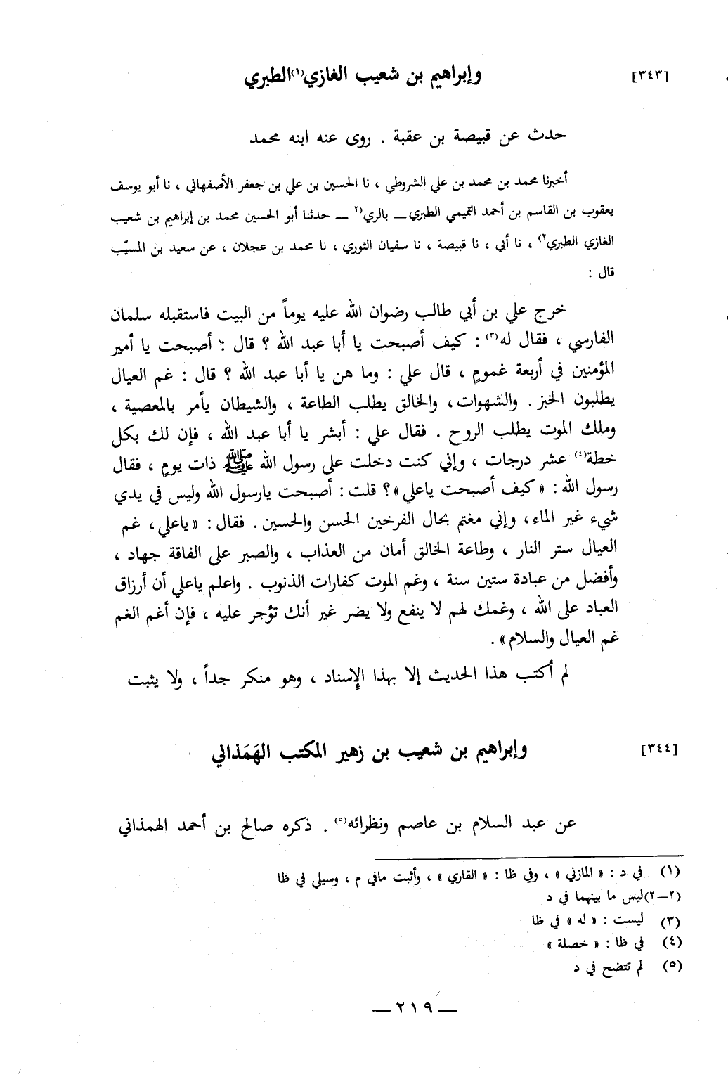 أَخْبَرَنَا مُحَمَّدُ بْنُ مُحَمَّدِ بْنِ عَلِيٍّ الشَّرُوطِيُّ، نَا الْحُسَيْنُ بْنُ عَلِيِّ بْنِ جَعْفَرٍ الأَصْفَهَانِيُّ، نَا أَبُو يُوسُفَ يَعْقُوبُ بْنُ الْقَاسِمِ بْنِ أَحْمَدَ التَّمِيمِيُّ الطَّبَرِيُّ، بِالرَّيِّ، حَدَّثَنَا أَبُو الْحُسَيْنِ مُحَمَّدُ بْنُ إِبْرَاهِيمَ بْنِ شُعَيْبٍ الْغَازِيُّ الطَّبَرِيُّ، نَا أَبِي، نَا قَبِيصَةُ، نَا سُفْيَانُ الثَّوْرِيُّ، نَا مُحَمَّدُ بْنُ عَجْلانَ، عَنْ سَعِيدِ بْنِ الْمُسَيِّبِ، قَالَ: خَرَجَ عَلِيُّ بْنُ أَبِي طَالِبٍ رِضْوَانُ اللَّهِ عَلَيْهِ يَوْمًا مِنَ الْبَيْتِ، فَاسْتَقْبَلَهُ سَلْمَانُ الْفَارِسِيُّ، فَقَالَ لَهُ: كَيْفَ أَصْبَحْتَ يَا أَبَا عَبْدِ اللَّهِ؟ قَالَ: أَصْبَحْتُ يَا أَمِيرَ الْمُؤْمِنِينَ فِي أَرْبَعَةِ غُمُومٍ، قَالَ عَلِيٌّ: وَمَا هُنَّ يَا أَبَا عَبْدِ اللَّهِ؟ قَالَ: غَمُّ الْعِيَالِ يَطْلُبُونَ الْخُبْزَ، وَالشَّهَوَاتِ، وَالْخَالِقُ يَطْلُبُ الطَّاعَةَ، وَالشَّيْطَانُ يَأْمُرُ بِالْمَعْصِيَّةِ، وَمَلَكُ الْمَوْتِ يَطْلُبُ الرُّوحَ، فَقَالَ عَلِيٌّ: أَبْشِرْ يَا أَبَا عَبْدِ اللَّهِ، فَإِنَّ لَكَ بِكُلِّ خِطَّةٍ عَشْرَةُ دَرَجَاتٍ، وَإِنِّي كُنْتُ دَخَلْتُ عَلَى رَسُولِ اللَّهِ صَلَّى اللَّهُ عَلَيْهِ وَسَلَّمَ ذَاتَ يَوْمٍ، فَقَالَ رَسُولُ اللَّهِ: «كَيْفَ أَصْبَحْتَ يَا عَلِيُّ»؟ قُلْتُ: أَصْبَحْتُ يَا رَسُولَ اللَّهِ وَلَيْسَ فِي يَدِي شَيْءٌ غَيْرُ الْمَاءِ، وَإِنِّي مُغْتَمٌّ بِحَالِ الْفَرْخَيْنِ الْحَسَنِ وَالْحُسَيْنِ، فَقَالَ: «يَا عَلِيُّ، غَمُّ الْعِيَالِ سَتْرُ النَّارِ، وَطَاعَةُ الْخَالِقِ أَمَانٌ مِنَ الْعَذَابِ، وَالصَّبْرُ عَلَى الْفَاقَةِ جِهَادٌ، وَأَفْضَلُ مِنْ عِبَادَةِ سِتِّينَ سَنَةً، وَغَمُّ الْمَوْتِ كَفَّارَاتُ الذُّنُوبِ، وَاعْلَمْ يَا عَلِيُّ أَنَّ أَرْزَاقَ