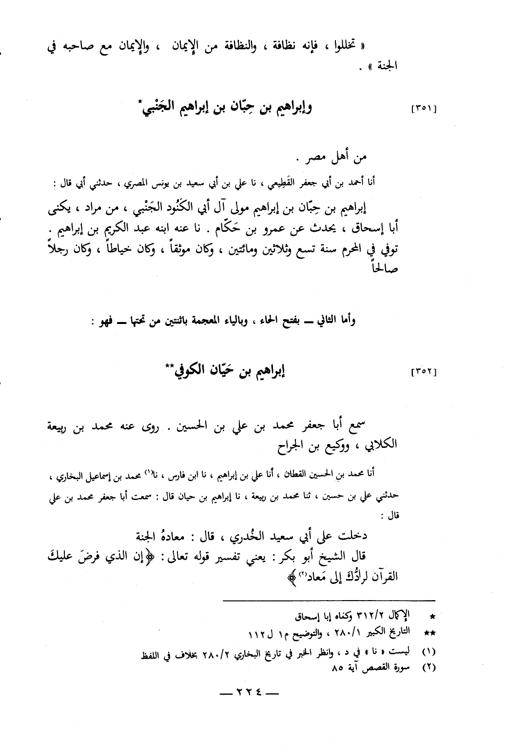 أَنَا مُحَمَّدُ بْنُ الْحُسَيْنِ الْقَطَّانُ، أَنَا عَلِيُّ بْنُ إِبْرَاهِيمَ، نَا ابْنُ فَارِسٍ، نَا مُحَمَّدُ بْنُ إِسْمَاعِيلَ الْبُخَارِيُّ، حَدَّثَنِي عَلِيُّ بْنُ حُسَيْنٍ، ثَنَا مُحَمَّدُ بْنُ رَبِيعَةَ، نَا إِبْرَاهِيمُ بْنُ حَيَّانَ، قَالَ: سَمِعْتُ أَبَا جَعْفَرٍ مُحَمَّدَ بْنَ عَلِيٍّ، قَالَ: دَخَلْتُ عَلَى أَبِي سَعِيدٍ الْخُدْرِيِّ، قَالَ: مَعَادُهُ الْجَنَّةُ قَالَ الشَّيْخُ أَبُو بَكْرٍ: يَعْنِي تَفْسِيرَ قَوْلِهِ تَعَالَى: {إِنَّ الَّذِي فَرَضَ عَلَيْكَ الْقُرْءَانَ لَرَادُّكَ إِلَى مَعَادٍ} [القصص: 85]
