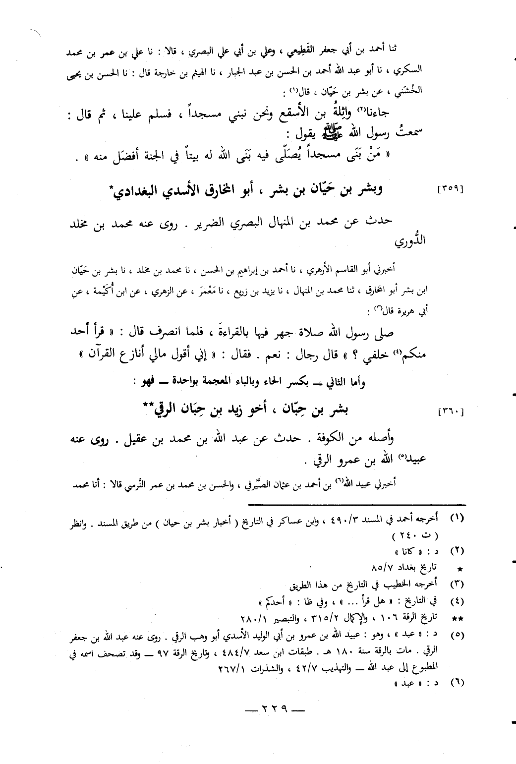 ثَنَا أَحْمَدُ بْنُ أَبِي جَعْفَرٍ الْقَطِيعِيُّ، وَعَلِيُّ بْنُ أَبِي عَلِيٍّ الْبَصْرِيُّ، قَالا: نَا عَلِيُّ بْنُ عُمَرَ بْنِ مُحَمَّدٍ السُّكَّرِيُّ، نَا أَبُو عَبْدِ اللَّهِ أَحْمَدُ بْنُ الْحَسَنِ بْنِ عَبْدِ الْجَبَّارِ، نَا الْهَيْثَمُ بْنُ خَارِجَةَ، قَالَ: نَا الْحَسَنُ بْنُ يَحْيَى الْخُشَنِيُّ، عَنْ بِشْرِ بْنِ حَيَّانَ، قَالَ: جَاءَنَا وَاثِلَةُ بْنُ الأَسْقَعِ وَنَحْنُ نَبْنِي مَسْجِدًا، فَسَلَّمَ عَلَيْنَا، ثُمَّ قَالَ: سَمِعْتُ رَسُولَ اللَّهِ صَلَّى اللَّهُ عَلَيْهِ وَسَلَّمَ يَقُولُ: «مَنْ بَنَى مَسْجِدًا يُصَلَّى فِيهِ بَنَى اللَّهُ لَهُ بَيْتًا فِي الْجَنَّةِ أَفْضَلَ مِنْهُ»