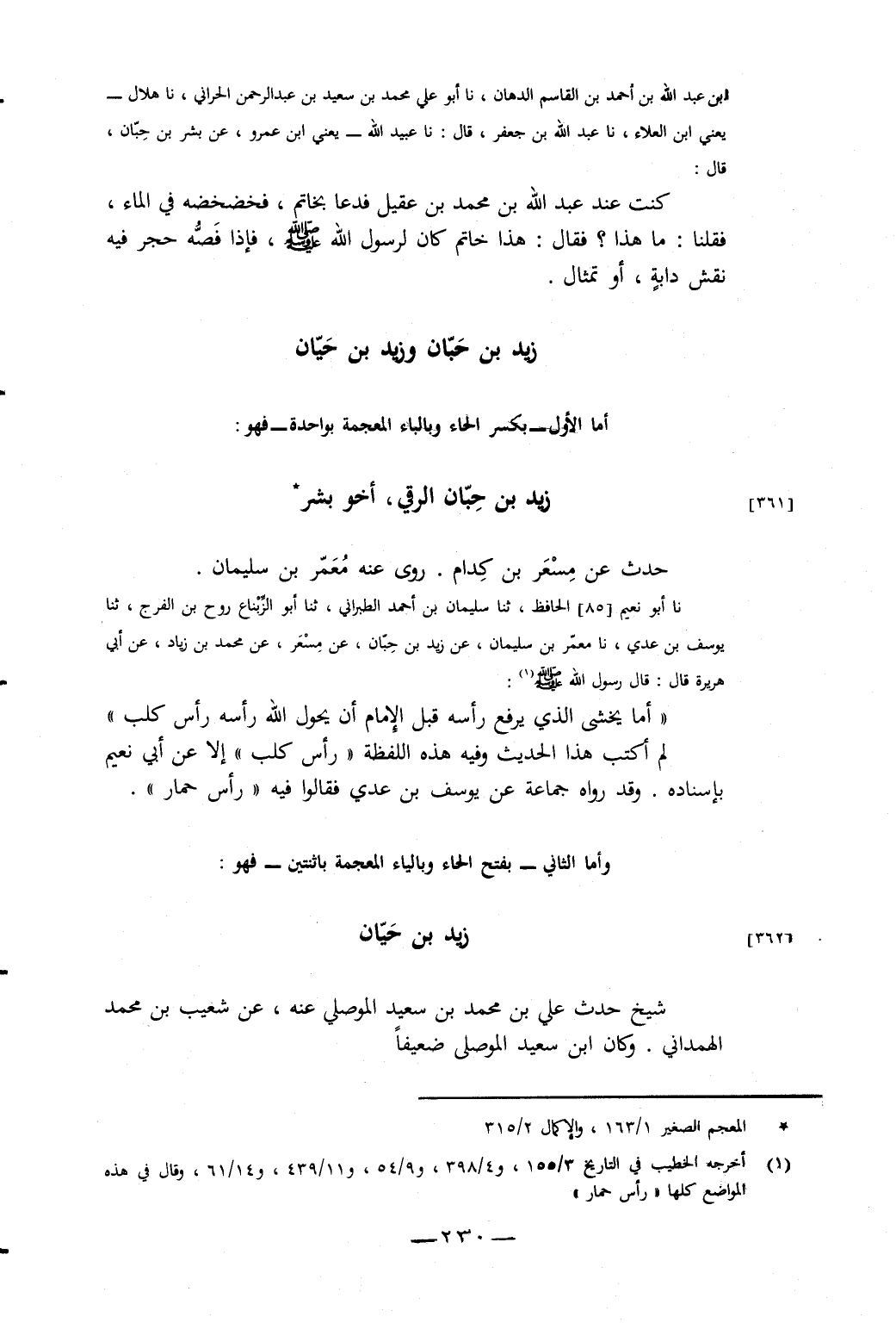 نَا أَبُو نُعَيْمٍ الْحَافِظُ، ثَنَا سُلَيْمَانُ بْنُ أَحْمَدَ الطَّبَرَانِيُّ، ثَنَا أَبُو الزِّنْبَاعِ رَوْحُ بْنُ الْفَرَجِ، ثَنَا يُوسُفُ بْنُ عَدِيٍّ، نَا مُعَمَّرُ بْنُ سُلَيْمَانَ، عَنْ زَيْدِ بْنِ حِبَّانَ، عَنْ مِسْعَرٍ، عَنْ مُحَمَّدِ بْنِ زِيَادٍ، عَنْ أَبُي هُرَيْرَةَ، قَالَ: قَالَ رَسُولُ اللَّهِ صَلَّى اللَّهُ عَلَيْهِ وَسَلَّمَ: «أَمَا يَخْشَى الَّذِي يَرْفَعُ رَأْسَهُ قَبْلَ الإِمَامِ أَنْ يُحَوِّلَ اللَّهُ رَأْسَهُ إِلَى رَأْسِ كَلْبٍ»، لَمْ أَكْتُبْ هَذَا الْحَدِيثَ وَفِيهِ هَذِهِ اللَّفْظَةُ «رَأْسُ كَلْبٍ» إِلا عَنْ أَبِي نُعَيْمٍ بِإِسْنَادِهِ، وَقَدْ رَوَاهُ جَمَاعَةٌ عَنْ يُوسُفَ بْنِ عَدِيٍّ فَقَالُوا فِيهِ «رَأْسُ حِمَارٍ»