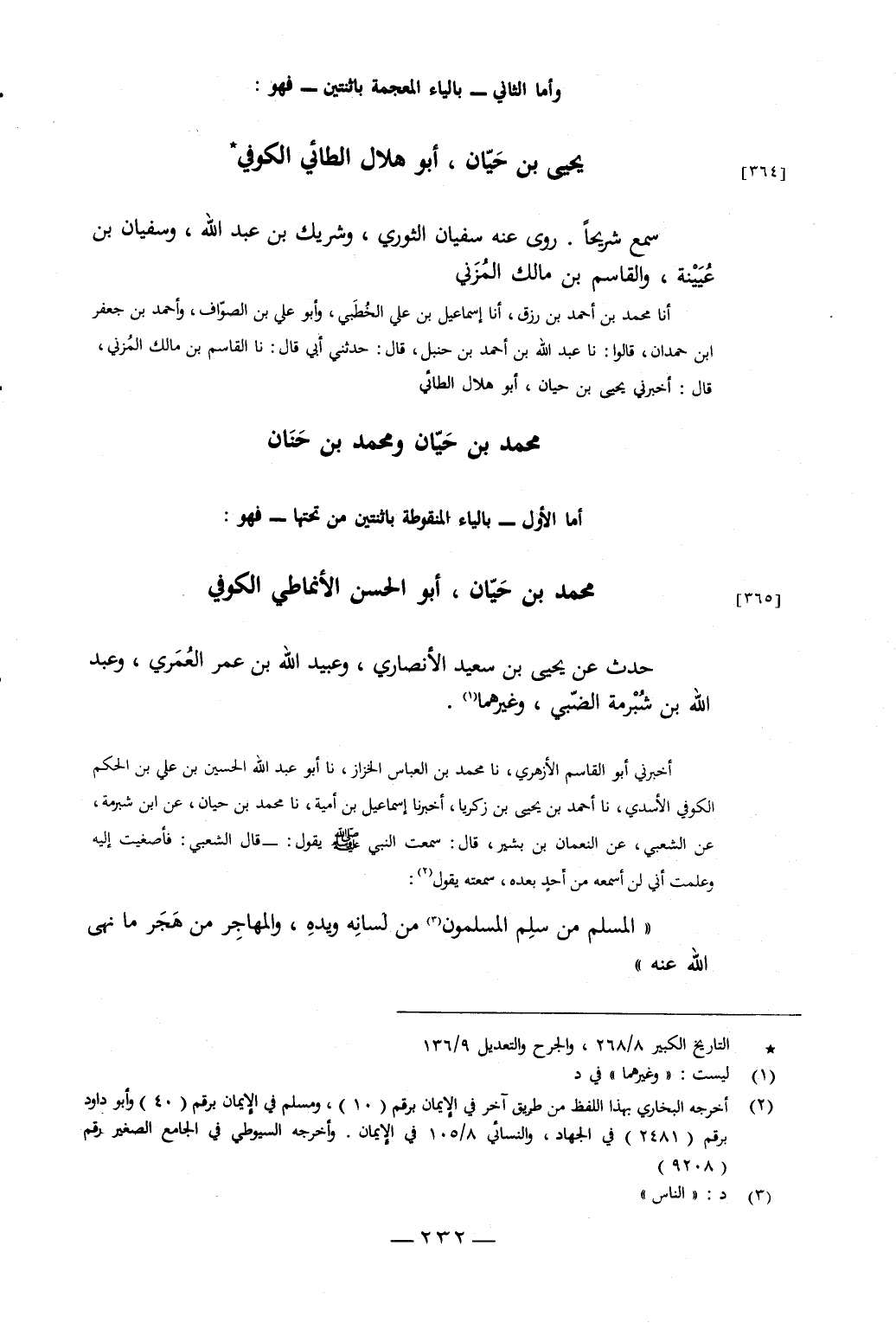 أَخْبَرَنِي أَبُو الْقَاسِمِ الأَزْهَرِيُّ، نَا مُحَمَّدُ بْنُ الْعَبَّاسِ الْخَزَّازُ، نَا أَبُو عَبْدِ اللَّهِ الْحُسَيْنُ بْنُ عَلِيِّ بْنِ الْحَكَمِ الْكُوفِيُّ الأَسَدِيُّ، نَا أَحْمَدُ بْنُ يَحْيَى بْنِ زَكَرِيَّا، أَخْبَرَنَا إِسْمَاعِيلُ بْنُ أُمَيَّةَ، نَا مُحَمَّدُ بْنُ حَيَّانَ، عَنِ ابْنِ شُبْرَمَةَ، عَنِ الشَّعْبِيِّ، عَنِ النُّعْمَانِ بْنِ بَشِيرٍ، قَالَ: سَمِعْتُ النَّبِيَّ يَقُولُ: قَالَ الشَّعْبِيُّ: فَأَصْغَيْتُ إِلَيْهِ وَعَلِمْتُ أَنِّي لَنْ أَسْمَعَهُ مِنْ أَحَدٍ بَعْدَهُ، سَمِعْتُهُ يَقُولُ: «الْمُسْلِمُ مَنْ سَلِمَ الْمُسْلِمُونَ مِنْ لِسَانِهِ وَيَدِهِ، وَالْمُهَاجِرُ مَنْ هَجَرَ مَا نَهَى اللَّهُ عَنْهُ»