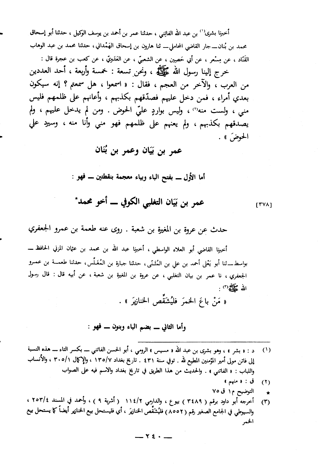 أَخْبَرَنَا بُشْرَى بْنُ عَبْدِ اللَّهِ الْفَاتِنِيُّ، حَدَّثَنَا عُمَرُ بْنُ أَحْمَدَ بْنِ يُوسُفَ الْوَكِيلُ، حَدَّثَنَا أَبُو إِسْحَاقَ مُحَمَّدُ بْنُ بُنَانٍ، جَارُ الْقَاضِي الْمَحَامِلِيِّ، ثَنَا هَارُونُ بْنُ إِسْحَاقَ الْهَمْدَانِيُّ، حَدَّثَنَا مُحَمَّدُ بْنُ عَبْدِ الْوَهَّابِ الْقَنَّادُ، عَنْ مِسْعَرٍ، عَنْ أَبِي حَصِينٍ، عَنِ الشَّعْبِيِّ، عَنِ الْعَدَوِيِّ، عَنْ كَعْبِ بْنِ عَجْرَةَ، قَالَ: خَرَجَ إِلَيْنَا رَسُولُ اللَّهِ صَلَّى اللَّهُ عَلَيْهِ وَسَلَّمَ، وَنَحْنُ تِسَعَةٌ: خَمْسَةٌ وَأَرْبَعَةٌ، أَحَدُ الْعَدَدَيْنِ مِنَ الْعَرَبِ، وَالآخَرُ مِنَ الْعَجَمِ، فَقَالَ: «اسْمَعُوا، هَلْ سَمِعْتُمْ؟ إِنَّهُ سَيَكُونُ بَعْدِي أُمَرَاءٌ، فَمَنْ دَخَلَ عَلَيْهِمْ فَصَدَّقَهُمْ بِكَذِبِهِمْ، وَأَعَانَهُمْ عَلَى ظُلْمِهِمْ فَلَيْسَ مِنْي، وَلَسْتُ مِنْهُ، وَلَيْسَ بِوَارِدٍ عَلَيَّ الْحَوْضَ، وَمَنْ لَمْ يَدْخُلْ عَلَيْهِمْ، وَلَمْ يُصَدِّقْهُمْ بِكَذِبِهِمْ، وَلَمْ يُعِنْهُمْ عَلَى ظُلْمِهِمْ فَهُوَ مِنِّي وَأَنَا مِنْهُ، وَسَيَرِدُ عَلَيَّ الْحَوْضَ»